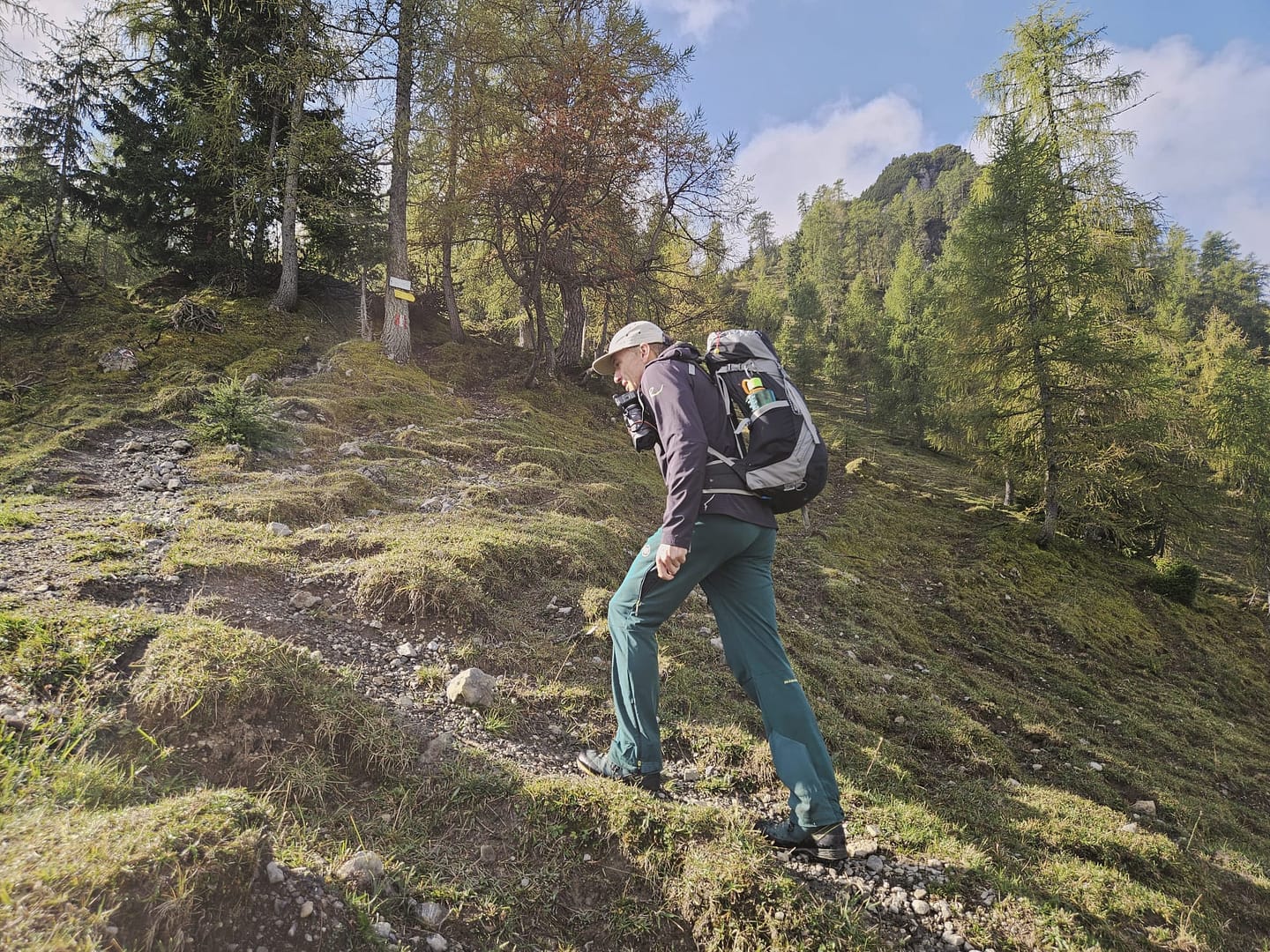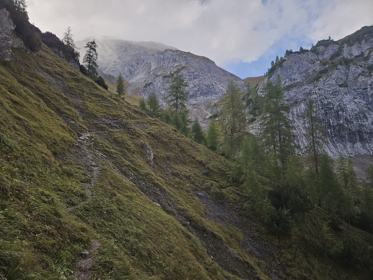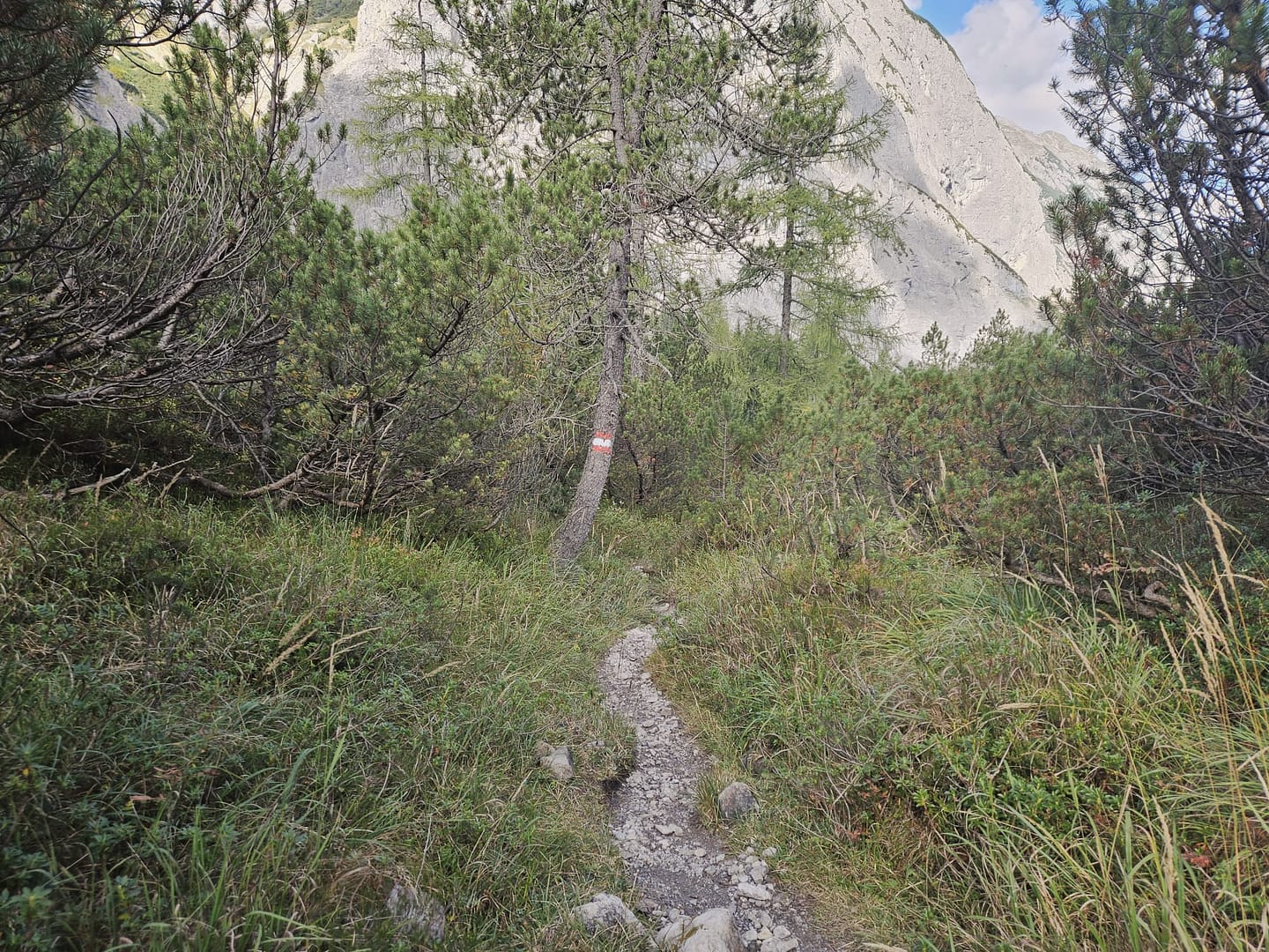 Vom Parkplatz folgt man ein Stück dem Tal hinein, bis kurz vor die Falzthurnalm. Links zweigt hier ein Serpentinensteig ab, der sich durch ein längeres Waldstück in südöstlicher Richtung hinaufschlängelt. Auf rund 1.520 m tritt man aus dem Wald heraus und steigt weiter südlich zur unbewirtschafteten Dristlalm (1.644 m), die idyllisch auf einer kleinen Almwiese liegt. Die rustikalen Holzbänke laden zu einer Pause ein – und mit etwas Glück grasen, wie bei uns, zahlreiche Gämsen in der Nähe.