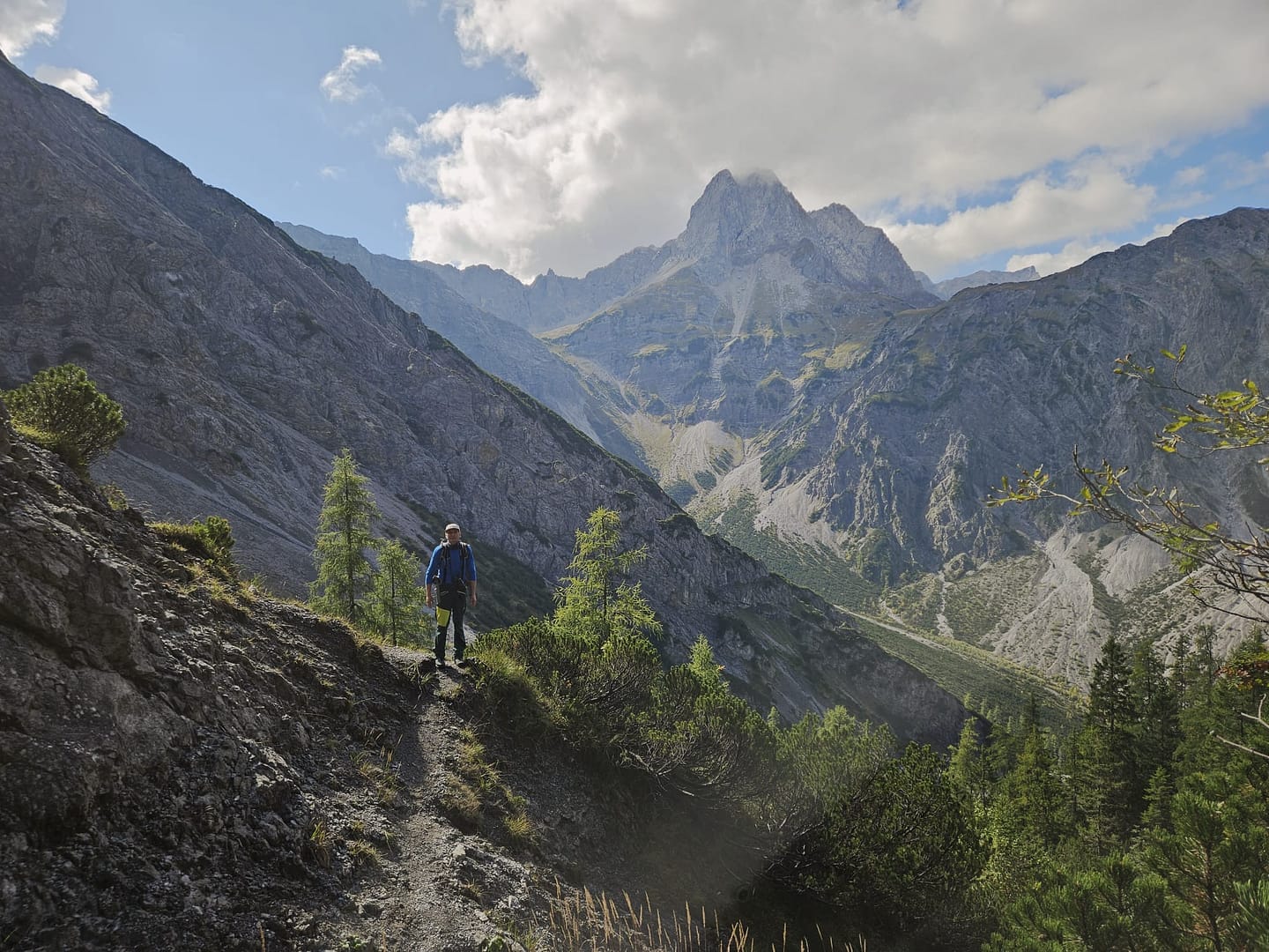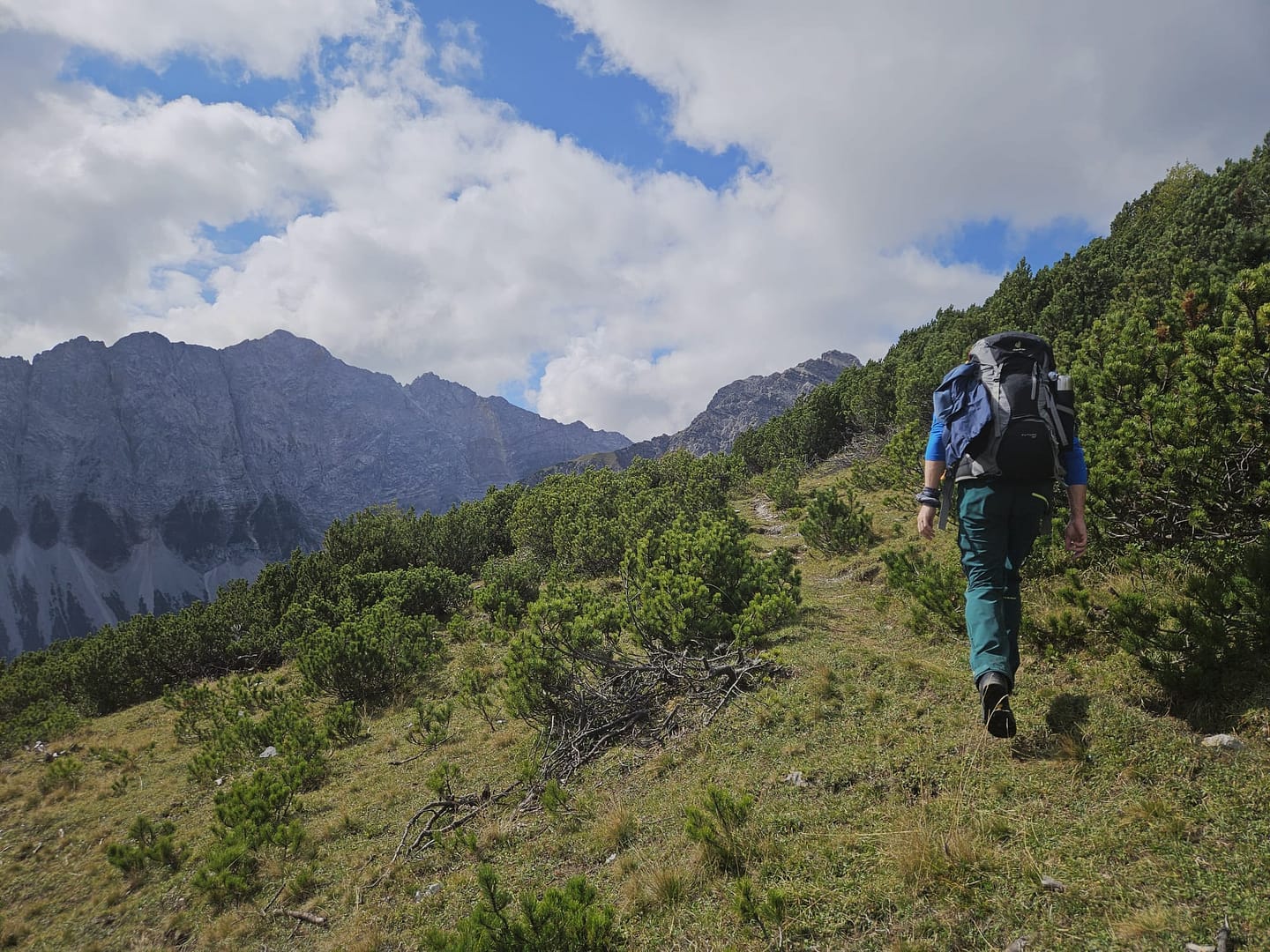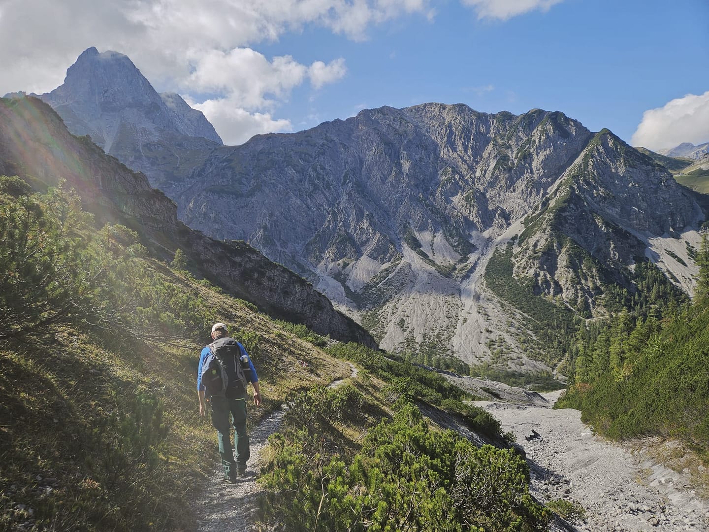 Von der Alm geht es über einen Rücken weiter bergan. Oben angekommen eröffnet sich ein weiter Blick auf den nächsten Streckenabschnitt, und in der Ferne ist bereits das Ziel zu erkennen. Der Pfad führt zunächst nach links über ein Verbindungsstück, auf dem wir ein paar Höhenmeter verlieren. Anschließend queren wir rechts ds Verbindungsstück und steigen anschließend in einem großen Bogen am linken Rand durch Geröll und Schutt zum Nauderer Kar auf. Auf 1.955 m erreichen wir eine weite Mulde, von der aus der Gipfel bereits zum Greifen nah scheint. Rechts haltend geht es über einen Geländerücken hinauf, bevor der Schlussanstieg über den steilen Nordrücken zum Gipfelkreuz führt.