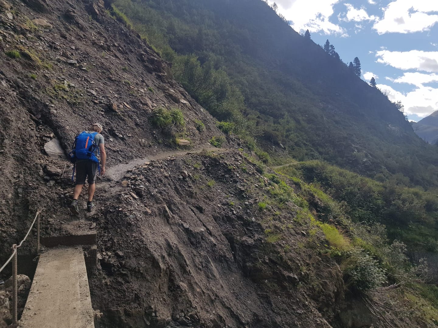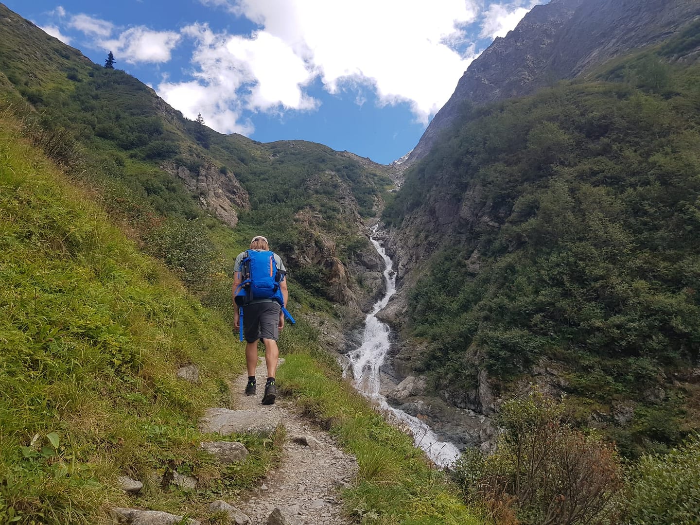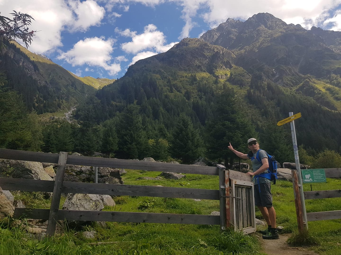 Vom großen Parkplatz hinter Weißwald sehen wir bereits die Hütte überqueren wir die Straße und bzw. das Häuschen von der Materialseilbahn. Schräg gegenüber vom Parkplatz am Weidegitter beginnt der ausgeschriebene zwei stündige Wanderweg zur Hütte. Der Weg schlängelt sich in Kehren die Schlucht hinauf, teilweise durch den Wald und parallel zum Kitzlesbach erklimmen wir die Höhenmeter Stück für Stück. Nachdem wir über eine kleine Brücke den Bach überschritten haben, wird das Gelände offener. Da es hier keine Abzweigung gibt, kann man sich auch nicht verlaufen, man lässt sich höchstens von der tollen Aussicht auf den Kaunergrat ablenken, wenn man einen Blick nach hinten wirft oder man verfällt den Himbeersträuchern, wo man die süßen Früchte genascht.
