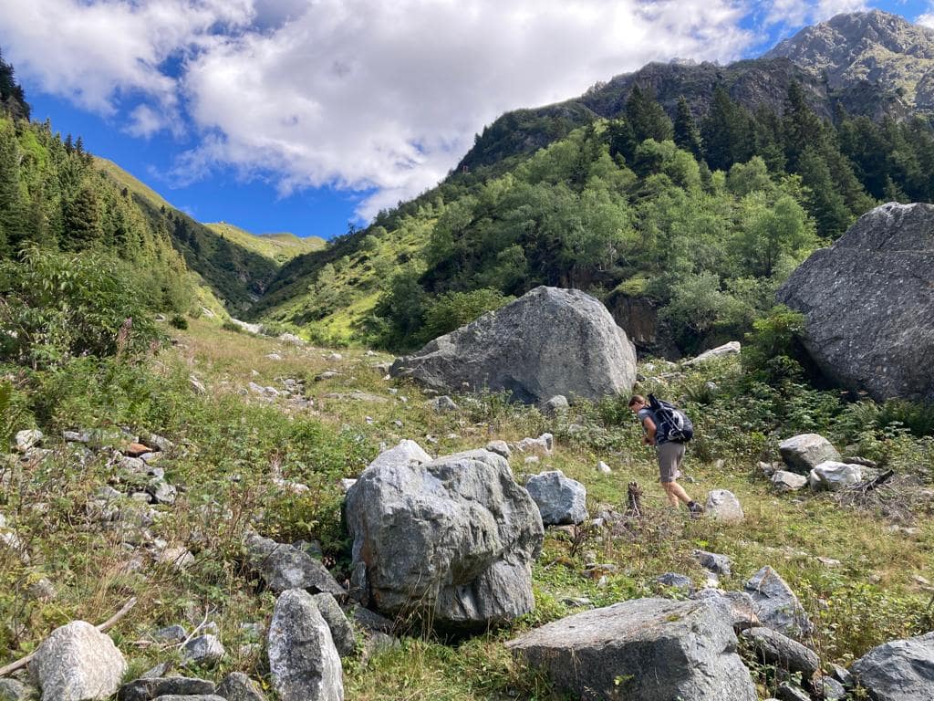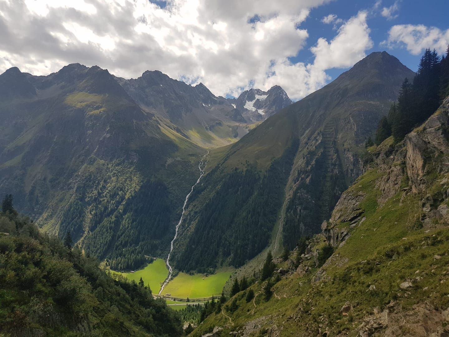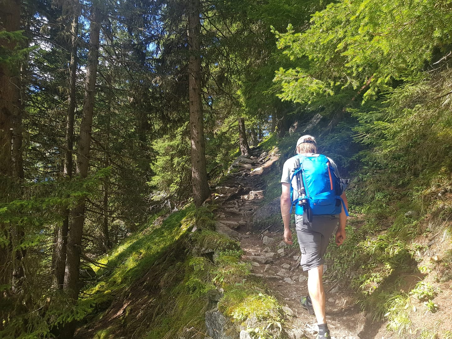 Vom großen Parkplatz hinter Weißwald sehen wir bereits die Hütte überqueren wir die Straße und bzw. das Häuschen von der Materialseilbahn. Schräg gegenüber vom Parkplatz am Weidegitter beginnt der ausgeschriebene zwei stündige Wanderweg zur Hütte. Der Weg schlängelt sich in Kehren die Schlucht hinauf, teilweise durch den Wald und parallel zum Kitzlesbach erklimmen wir die Höhenmeter Stück für Stück. Nachdem wir über eine kleine Brücke den Bach überschritten haben, wird das Gelände offener. Da es hier keine Abzweigung gibt, kann man sich auch nicht verlaufen, man lässt sich höchstens von der tollen Aussicht auf den Kaunergrat ablenken, wenn man einen Blick nach hinten wirft oder man verfällt den Himbeersträuchern, wo man die süßen Früchte genascht.