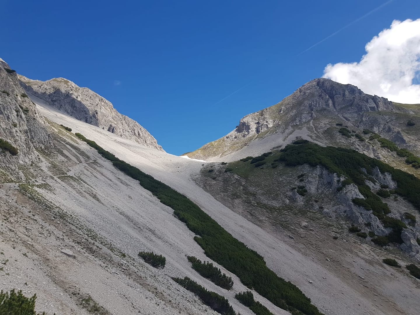 Ab Scharte kann man entweder über den Wanderweg runter gehen, welcher aber auch mit Schotter übersäht ist oder direkt über das Schotterfeld nach unten sausen. Ich habe es so halb-halb gemacht. Unten führt der Weg über eine Forststraße zurück zur Rumer Alm und wenig später auf den letzten Absiteg zurück zum Parkplatz.