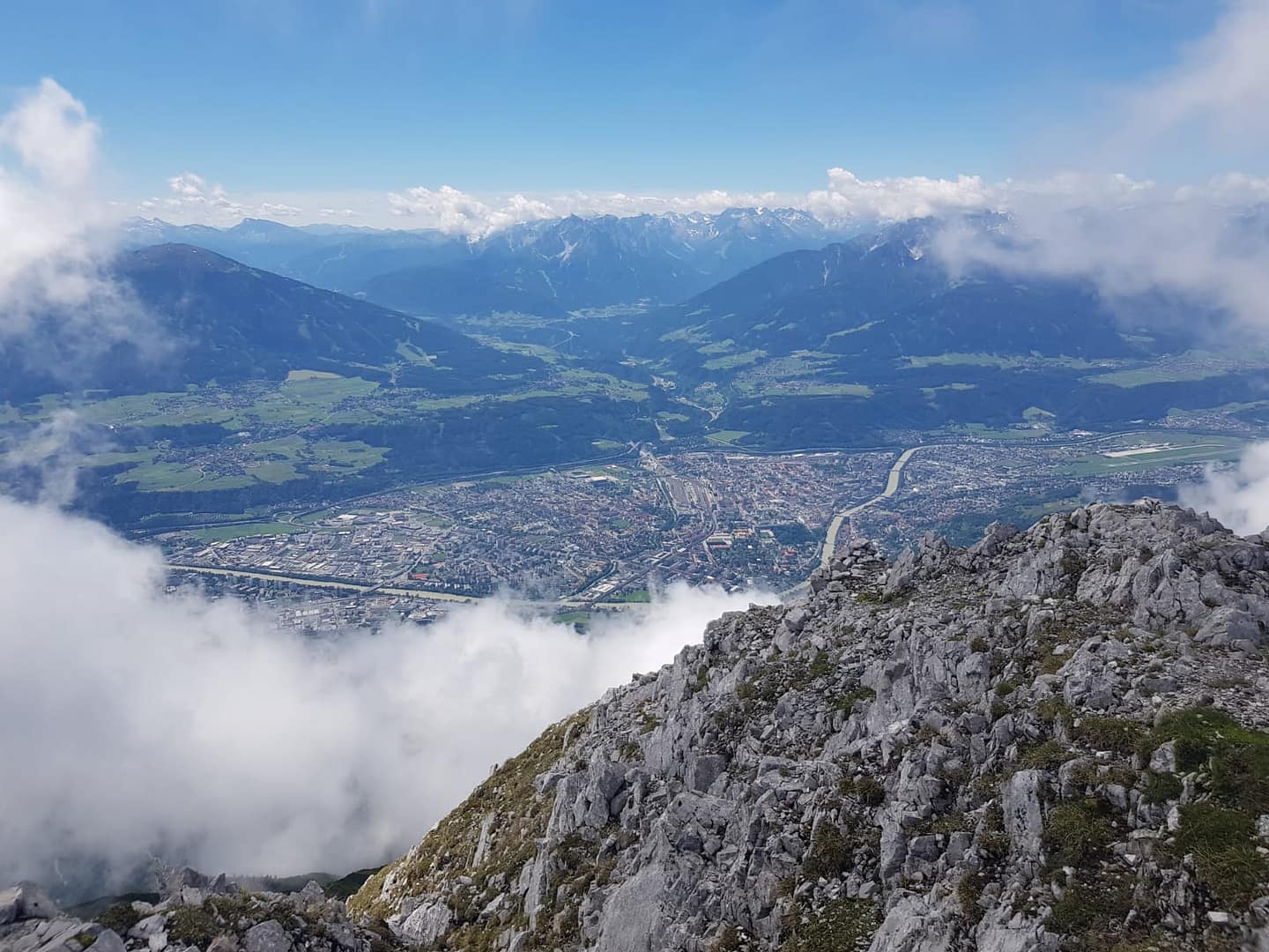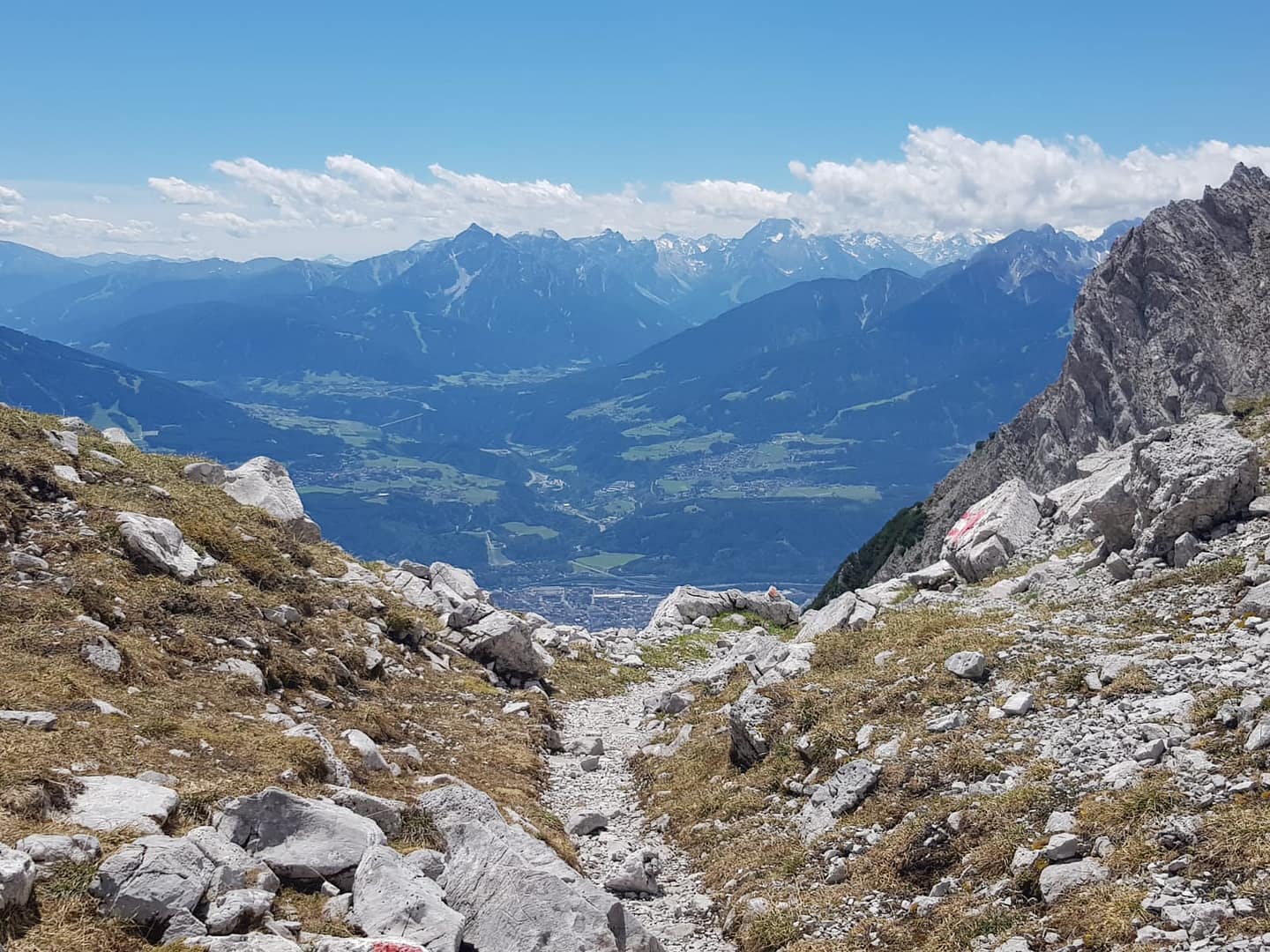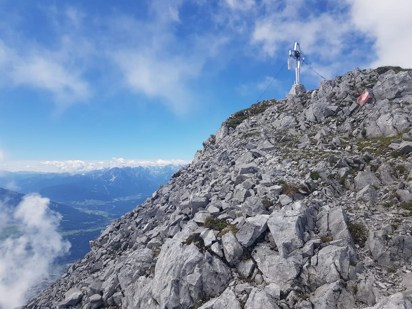 In Serpentinen und einer weiteren Flankenquerung Richtung Osten kommt man zur Beschilderung „Kreuzjöchl“, welche man weiter folgt. Ab hier wird es leicht ausgesetzt, aber es geht noch gut zu gehen. Unten am Schotterfeld angekommen führt der Weg rauf zum Kreuzjöchl, diesen habe ich rechts liegen gelassen, obwohl dies kein großer Umweg gewesen wäre. Es geht weiter zum Ostgrat der Rumer Spitze. Dieser ist mit roten Markierungen gut ersichtlich, erst wieder in Serpentinen und dann durch eine recht brüchige Rinne rauf. Bei mir lag noch Schnee in der Rinne, aber diesen konnte man gut umklettern. In leichter Kletterei geht es auf den Rücken rauf und von dort im Gehgelände bis zum Gipfel. Ich war ganz alleine oben und konnte die Ruhe, sowie den erstaunlichen Ausblick in vollen Zügen genießen.