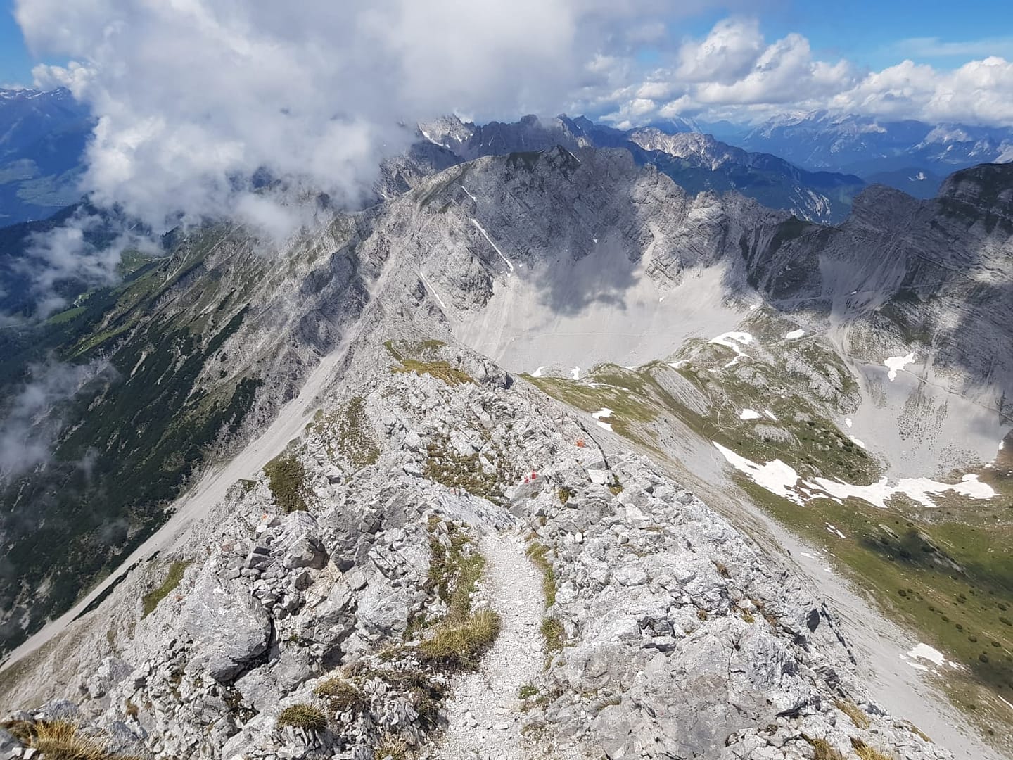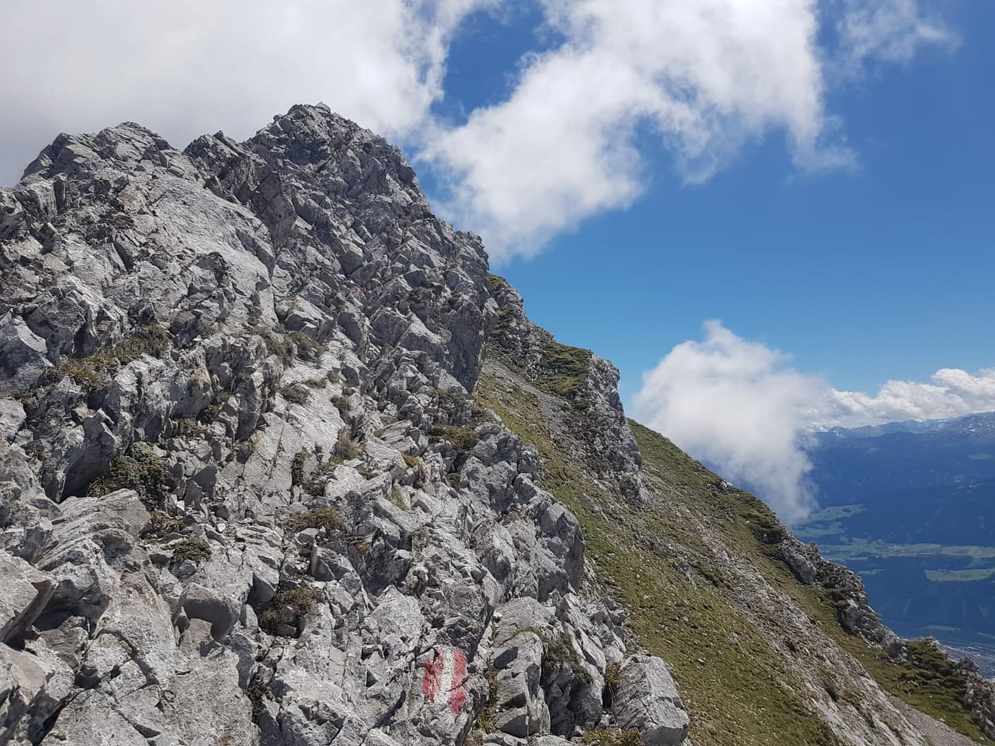 Über den Westgrat ging es wieder runter. Der Beginn ist eher unschwierig, erst mit der Zeit nimmt die Schwierigkeit zu. Der Weg ist sehr gut markiert, so dass man genau weiß wo es weiter geht, teils genau auf dem Grat, teils in den Flanken geht es runter zur Arzler Scharte. Ab hier tauchten dann die Menschenmassen auf, die auf die umliegenden Berge bzw. Hütten gegangen waren.