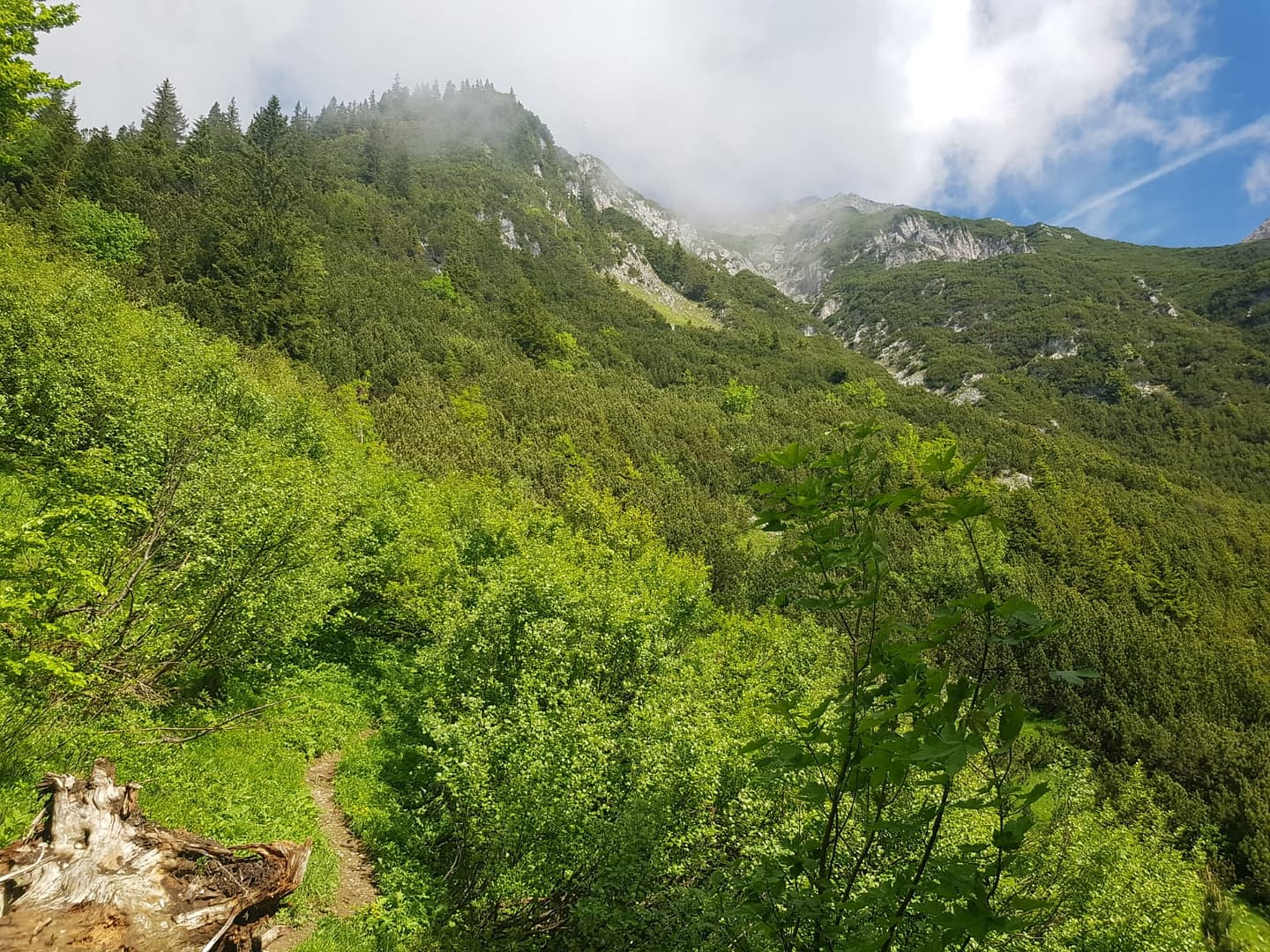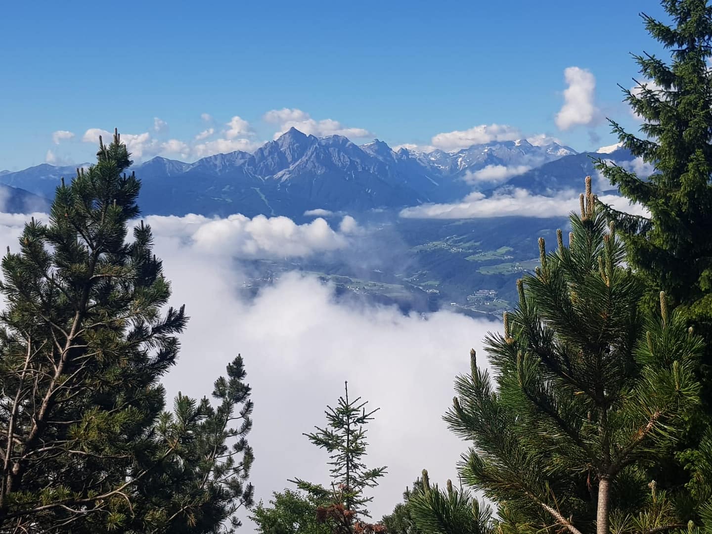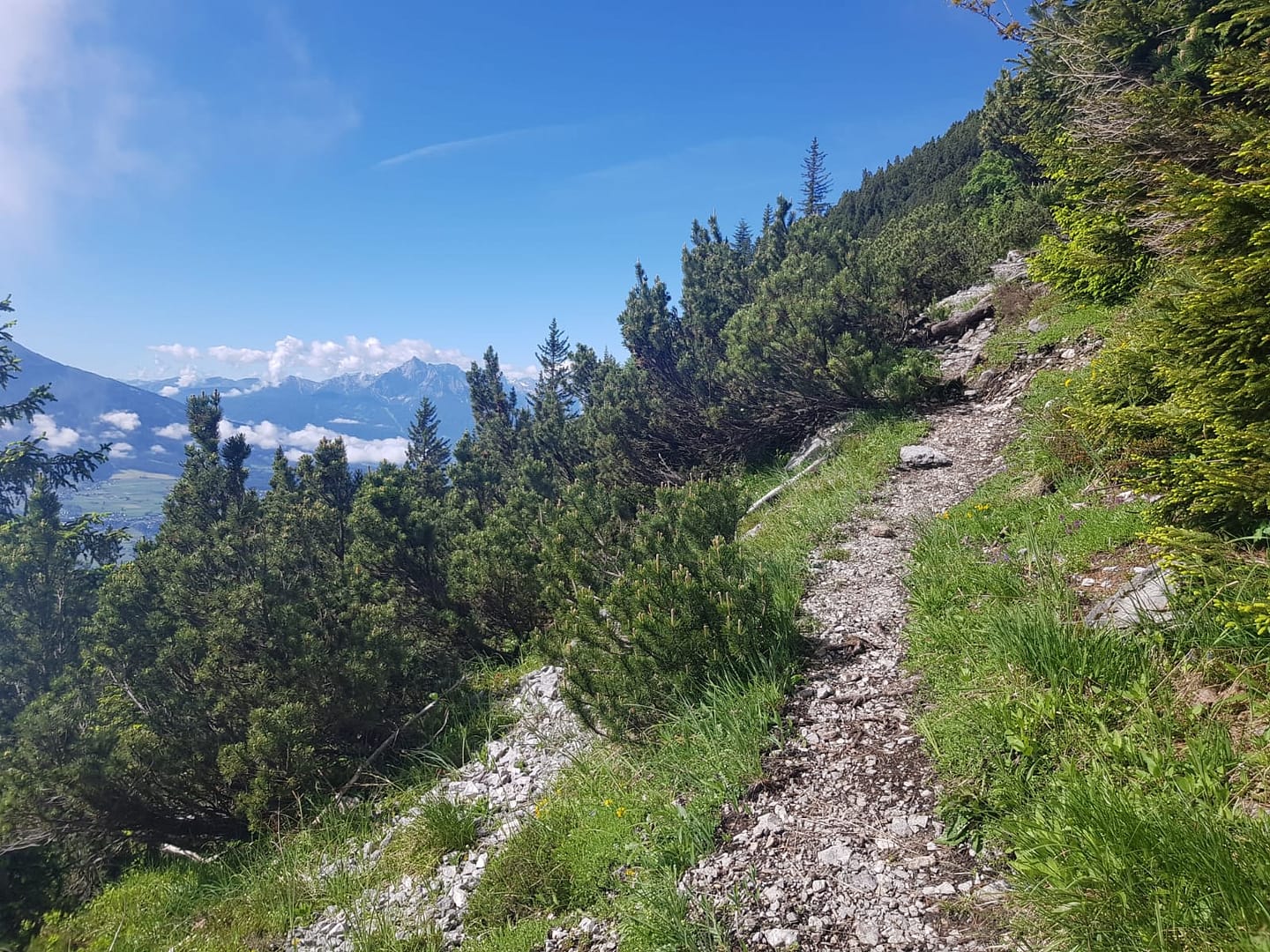 Durch den Wald gewinnt man zugig an Höhe und schon bald kommt man auf einen langen Bergrücken, wo man bereits ins Tal auf Innsbruck runtergucken kann. Auf dem Bergrücken geht es steil bergauf, später quert man die Flanke und kommt wieder zurück auf die Forststraße. Direkt in der Schranke führt der weitere Weg nach rechts hinauf (links geht es zur Alm). Später beigt man links auf einen schmalen Pfad 218/5 ab.