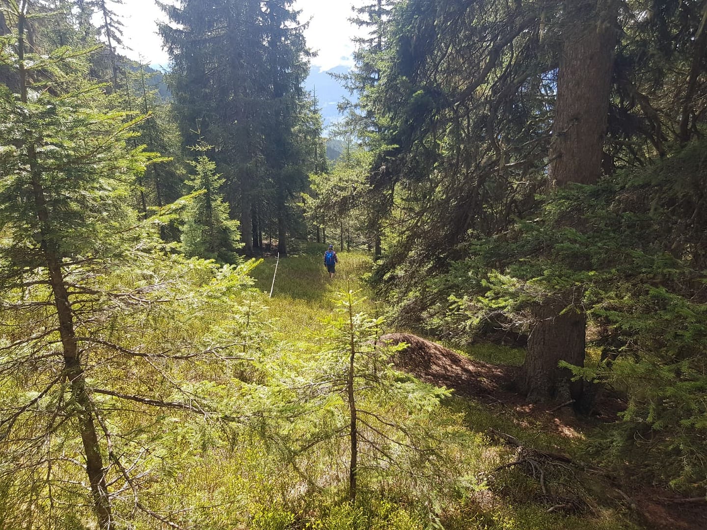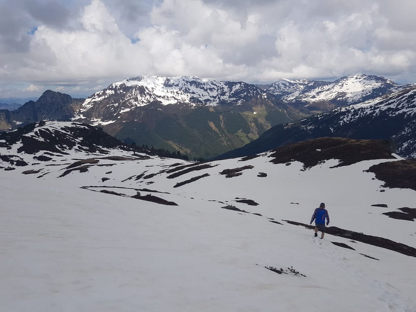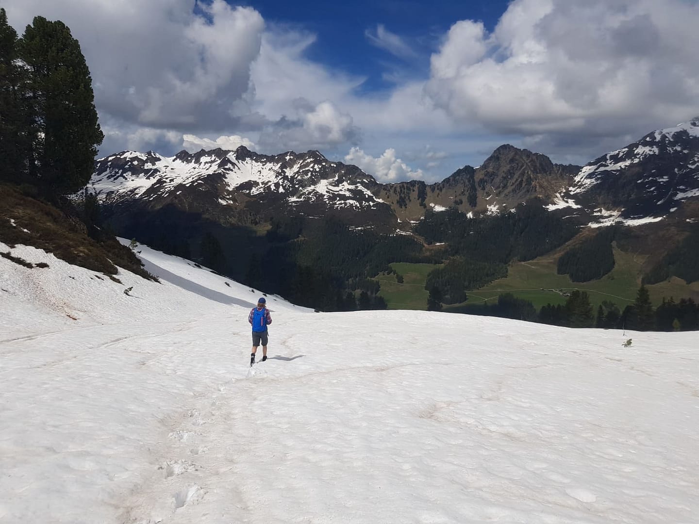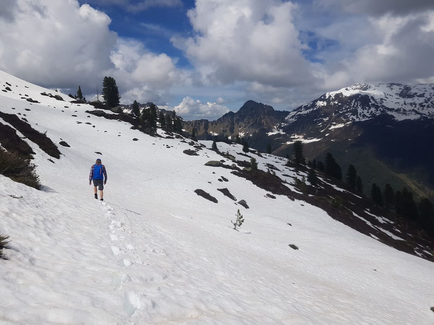 Da der Weg über die Forststraße wenig spannend war, entscheiden wir uns für den Abstieg über die andere Seite, Richtung Nord-Nordost (Kühsteinalm), über ein Schneefeld. Ab den Drei Seen auf 2.070 Metern gelangen wir wieder auf einen markierten Wanderweg. Auf 1.770 Metern, bei der Heubergalm, wird es dann abenteuerlich: Laut Outdooractive existiert hier noch ein Wanderweg. Tatsächlich entdecken wir einen Trampelpfad und verblasste Markierungen, doch auch dieser Weg scheint lange nicht begangen worden zu sein.