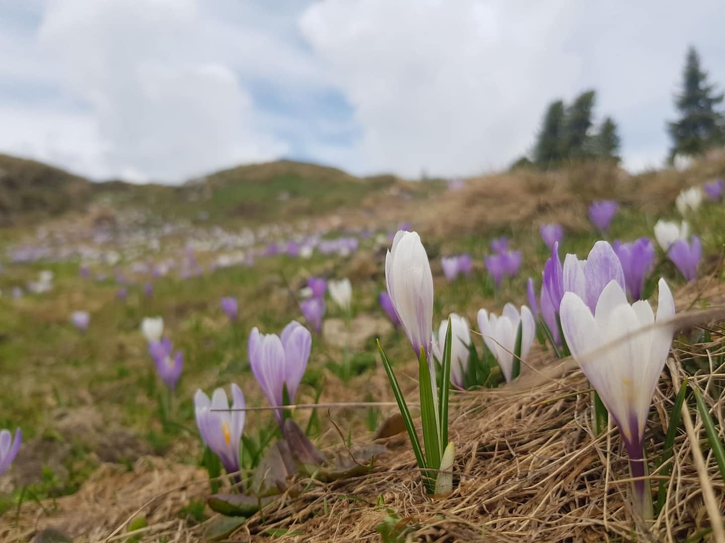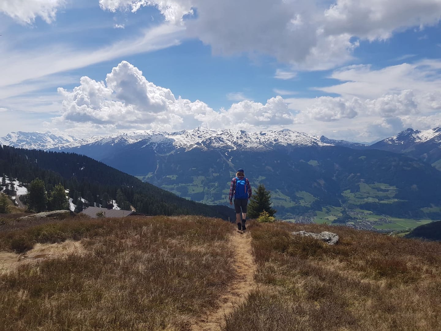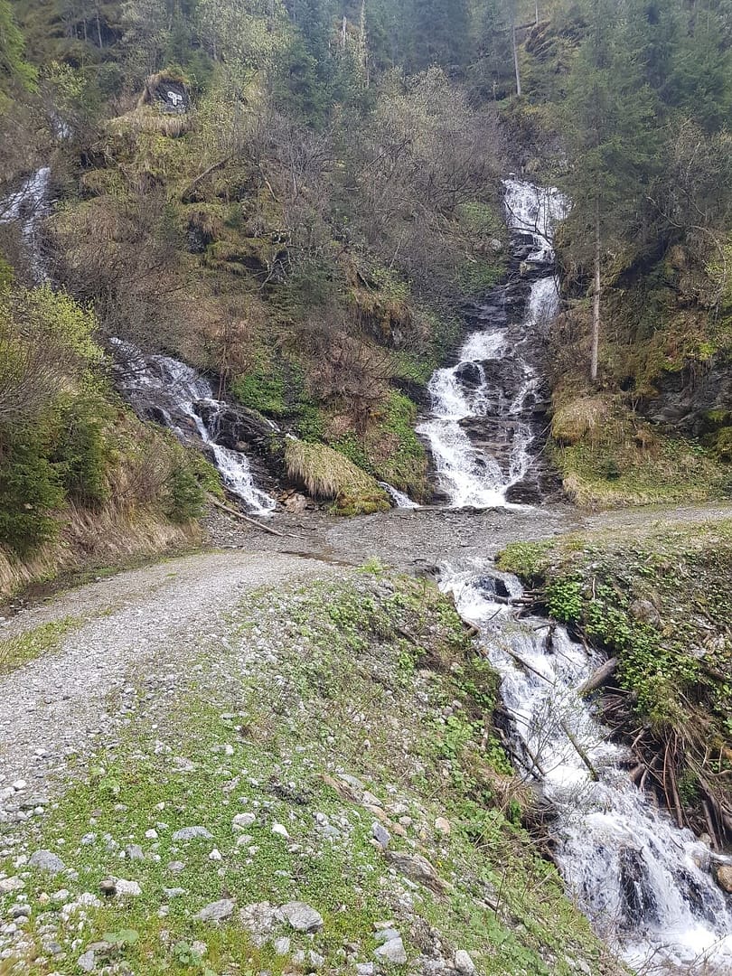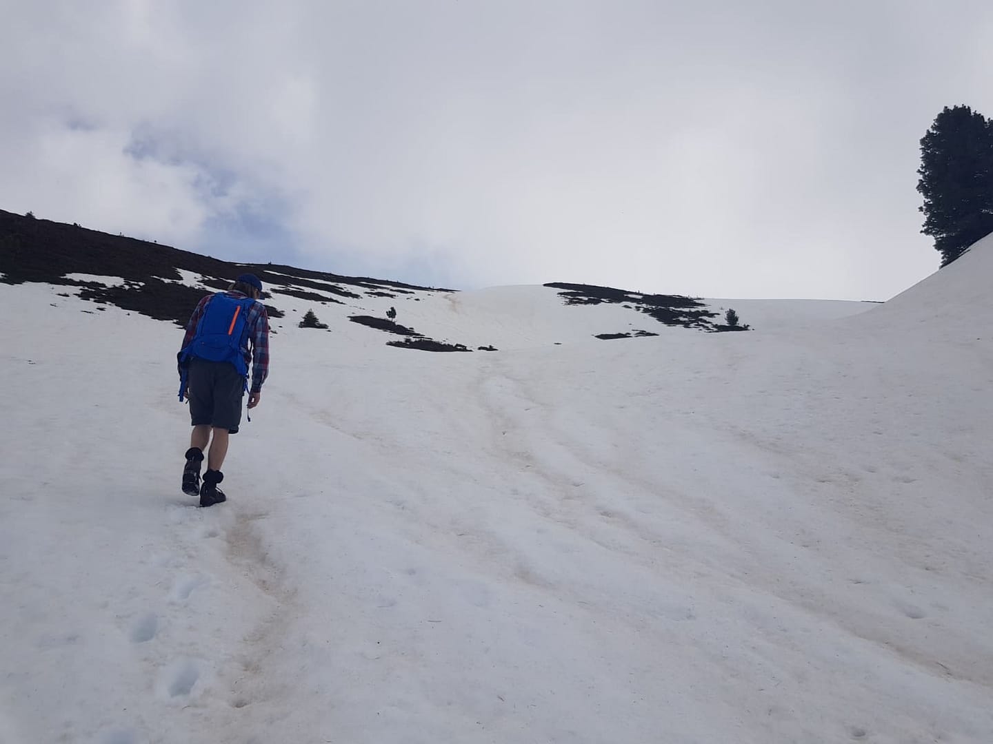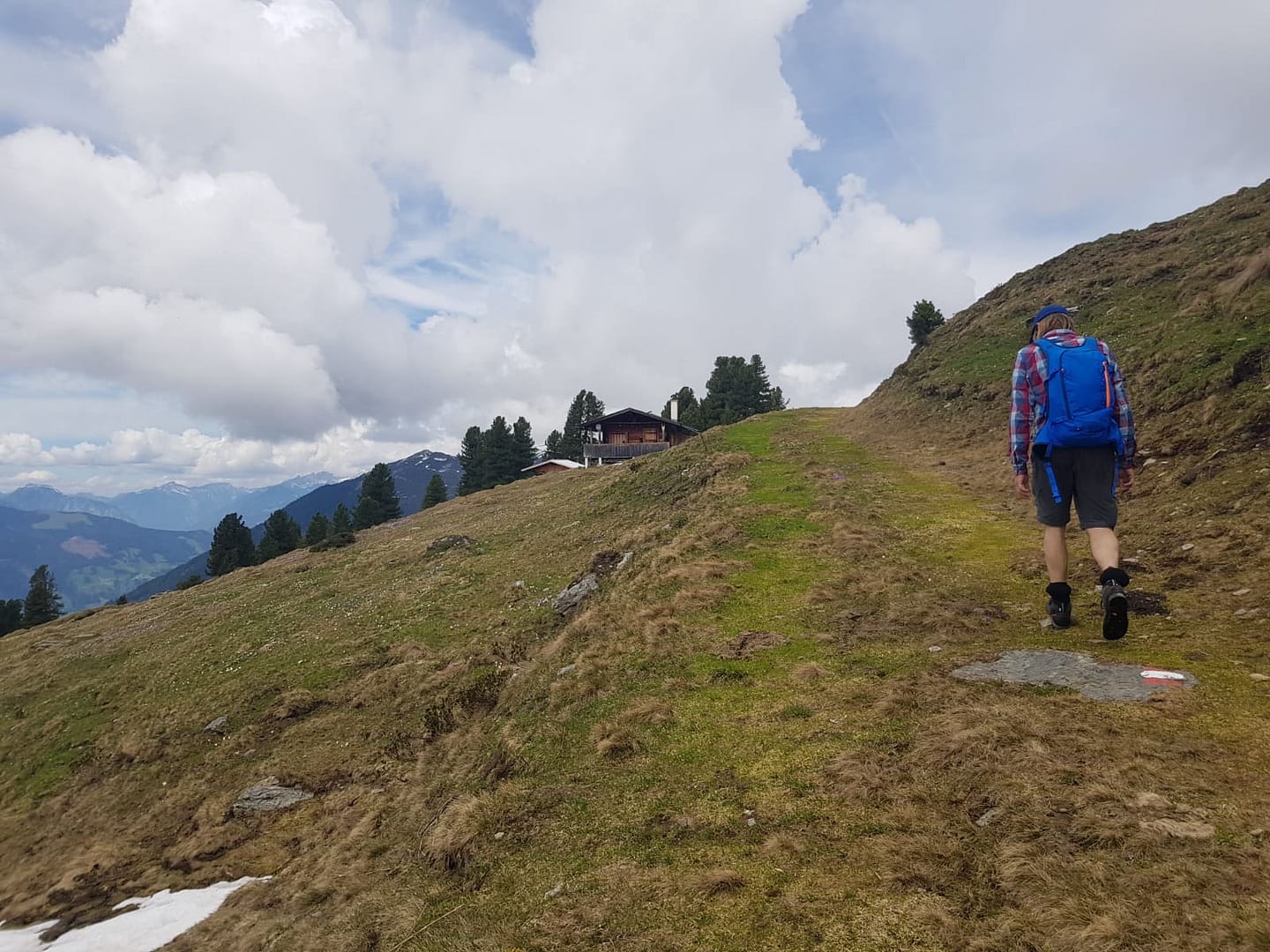 Da der Weg über die Forststraße wenig spannend war, entscheiden wir uns für den Abstieg über die andere Seite, Richtung Nord-Nordost (Kühsteinalm), über ein Schneefeld. Ab den Drei Seen auf 2.070 Metern gelangen wir wieder auf einen markierten Wanderweg. Auf 1.770 Metern, bei der Heubergalm, wird es dann abenteuerlich: Laut Outdooractive existiert hier noch ein Wanderweg. Tatsächlich entdecken wir einen Trampelpfad und verblasste Markierungen, doch auch dieser Weg scheint lange nicht begangen worden zu sein.