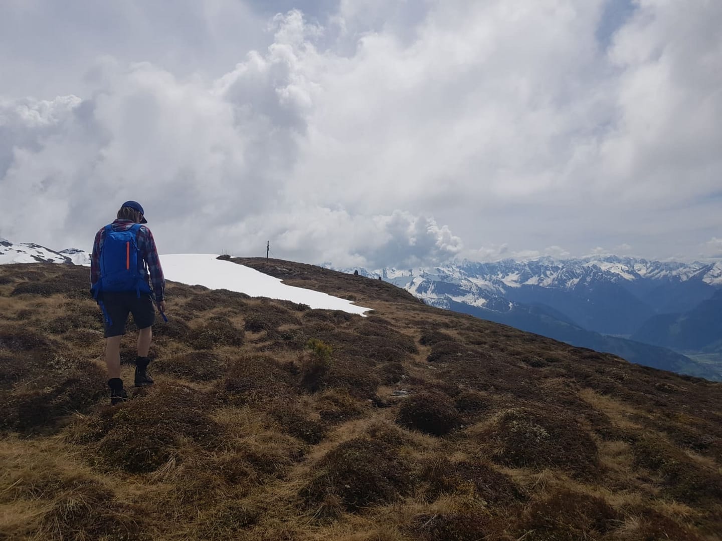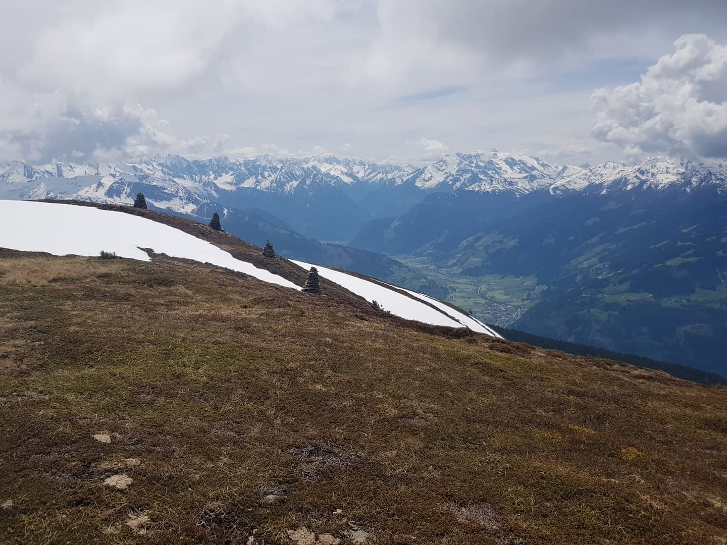Von hier aus geht es weiter in östliche Richtung und dann nach Südosten direkt auf das Schartenjoch zu. Der Ausblick von hier ist atemberaubend: das Zillertal erstreckt sich vor uns und bei klarem Wetter reicht der Blick bis zum Achensee.