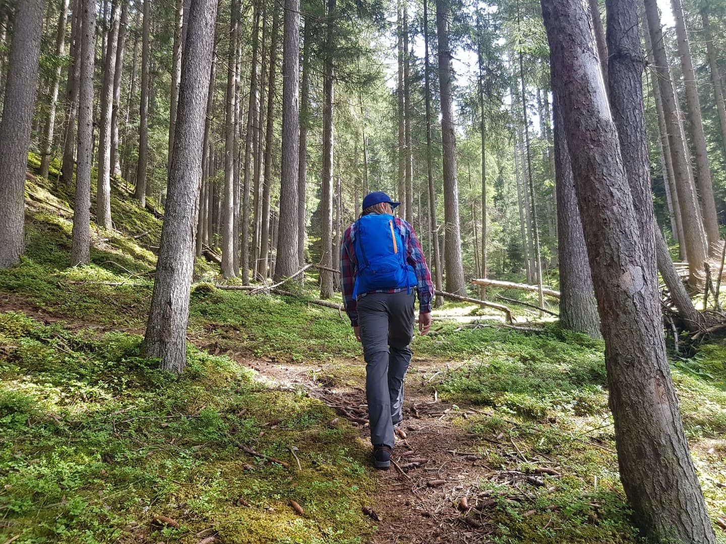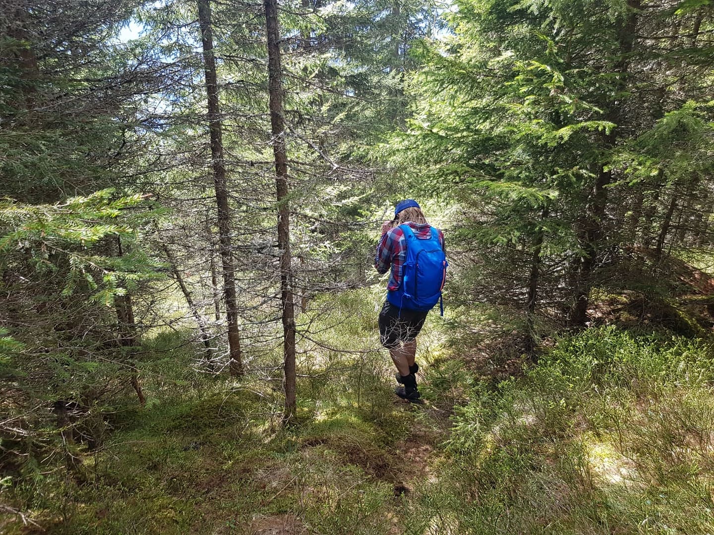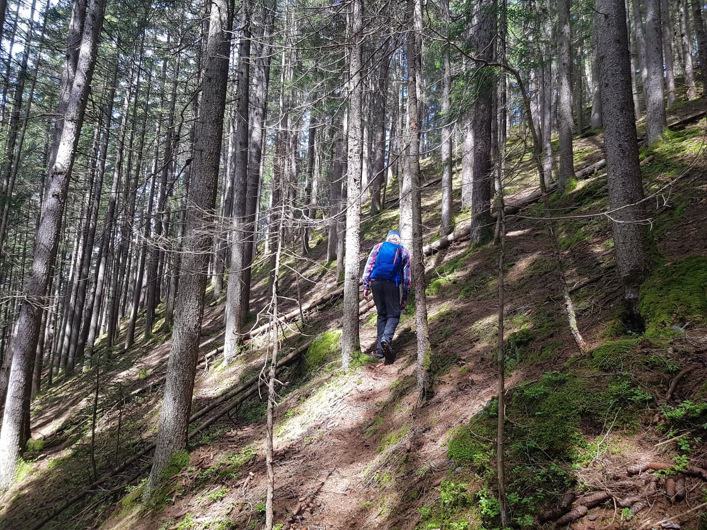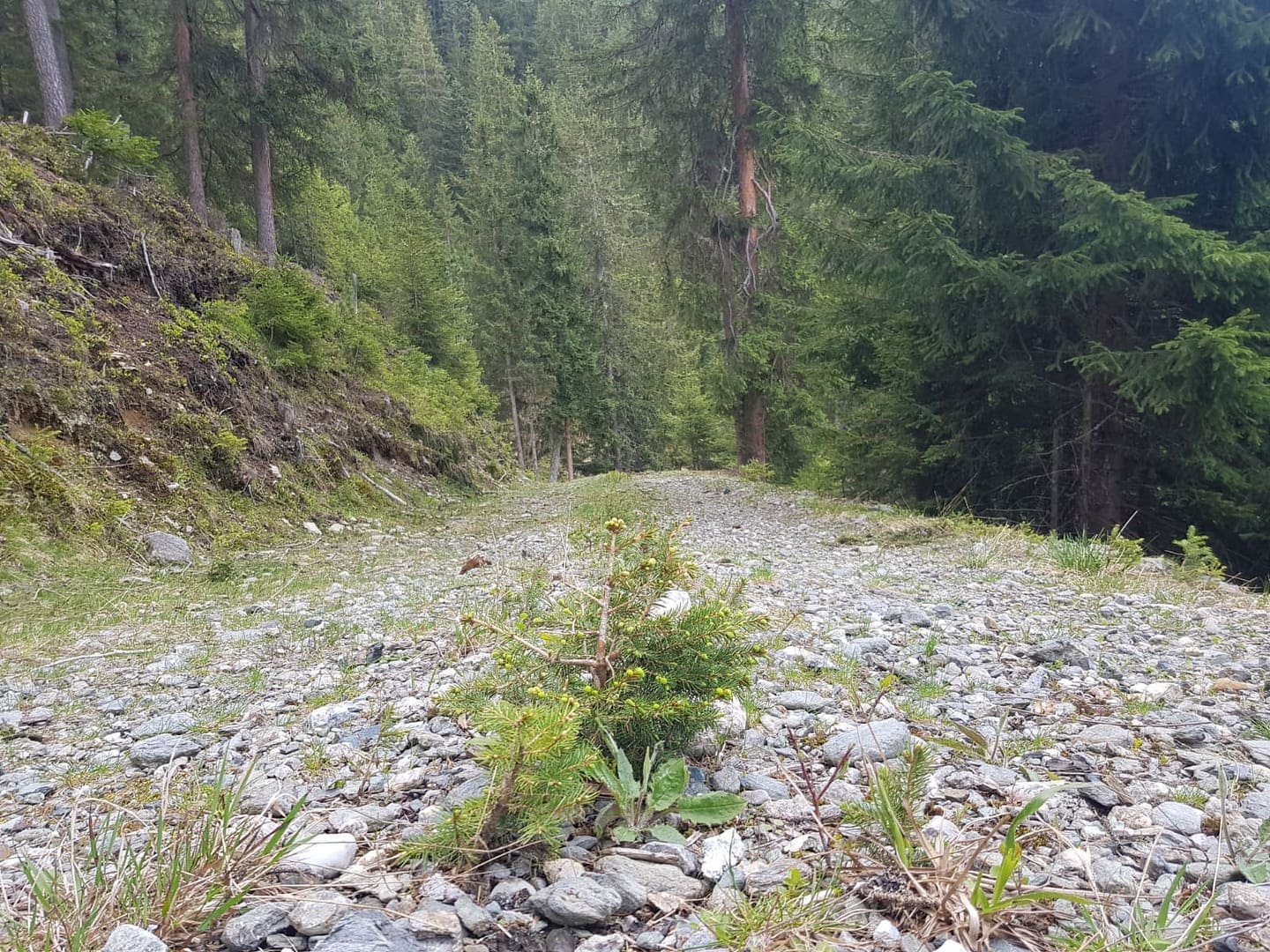 Vom Parkplatz aus folgen wir zunächst der Forststraße für etwa 300 Meter, bevor wir rechts abbiegen. Wer die monotone Forststraße meiden möchte, kann nach weiteren 800 Metern links auf einen Waldpfad abzweigen. Achtung, dieser Weg ist stellenweise sehr steil und scheinbar wenig begangen, denn die Tierwechselspuren machen es leicht, den Pfad aus den Augen zu verlieren.