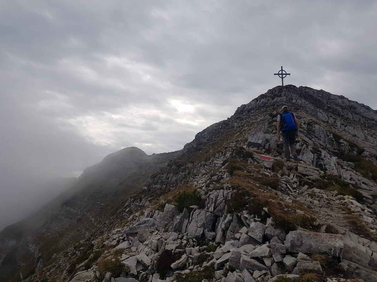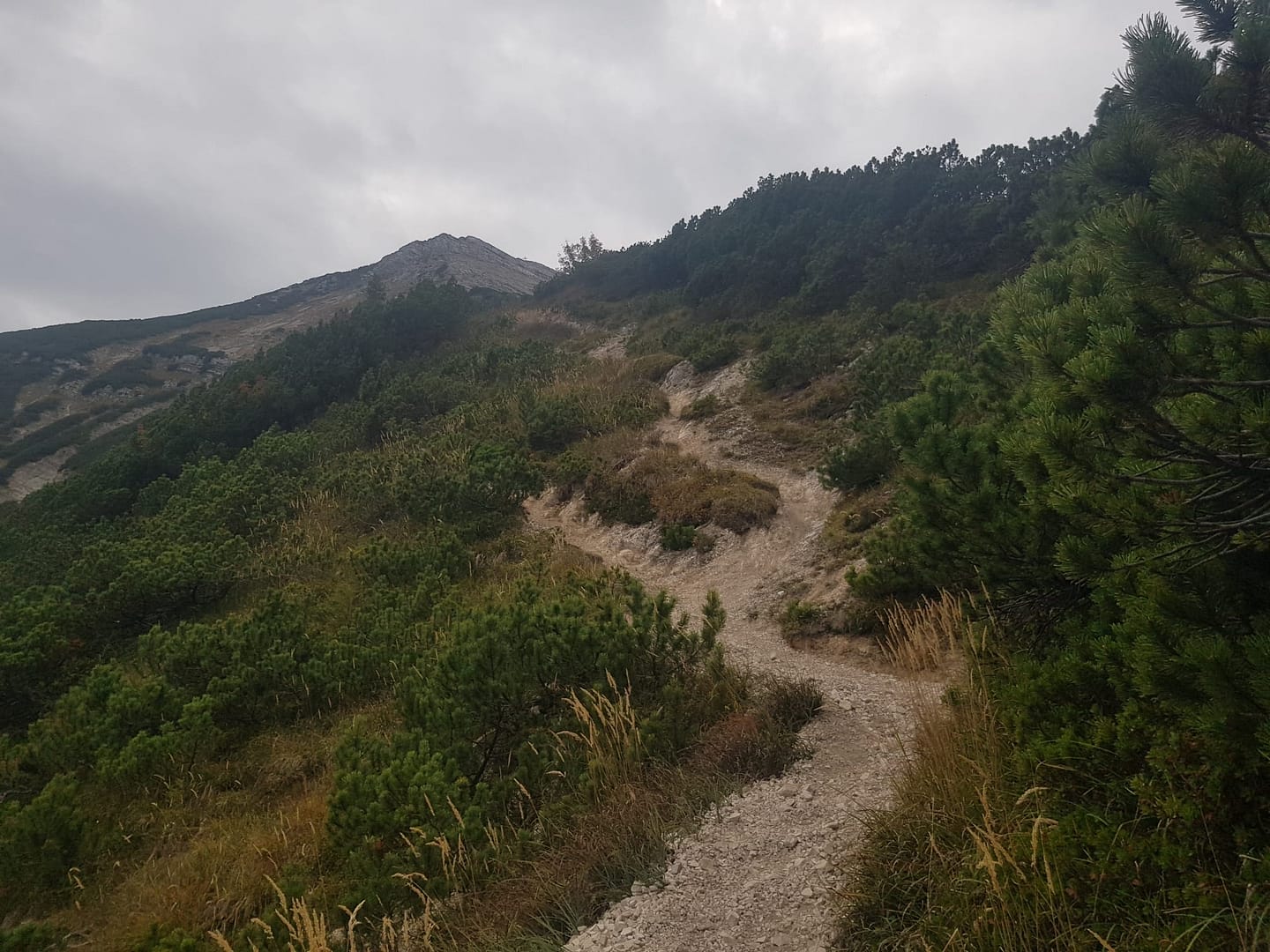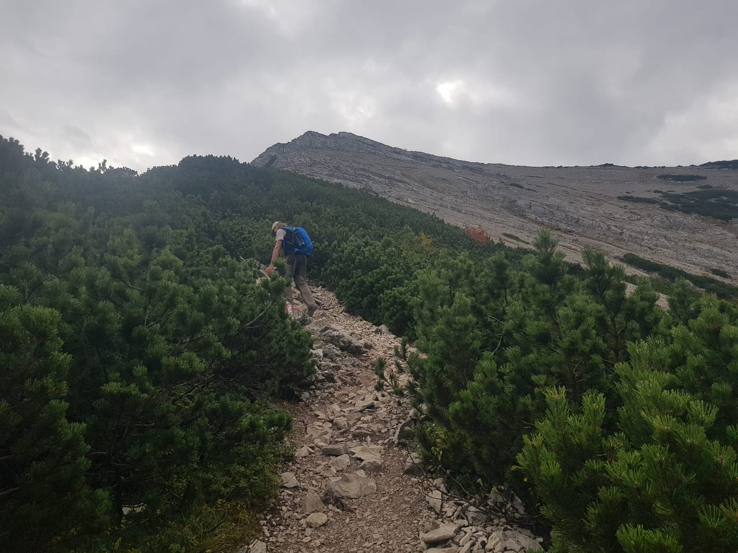 Hinter der Alm geht es weiter über einen Pfad kurz nach Nordosten und wenig später Richtung Süden, der Wegweiser ist interessanter Weise sehr bodennah. Zunächst führt der Weg durch lichten Wald, welcher durch die Latschenzone schnell abgelöst wird. Darauf folgt ein mit fels- und schuttdurchsetzes Gebiet, welches hoch zum Gipfel führt. Abgesehen davon, dass einige Teile vom Weg ausgespült sind, ist es ein toller Anstieg über den Rücken hoch zum Gipfelkreuz, von wo man einen tollen Rundumblick hat.