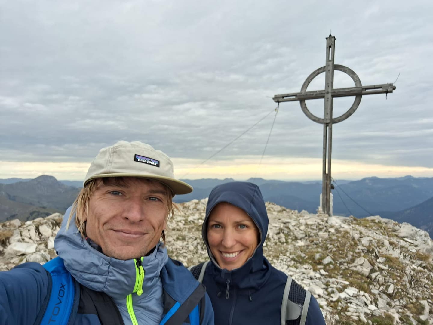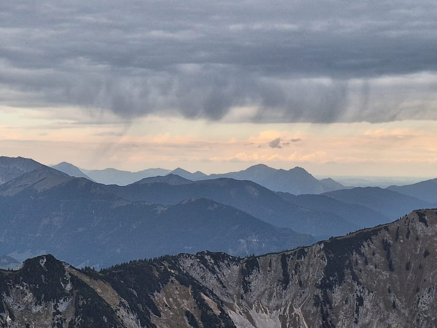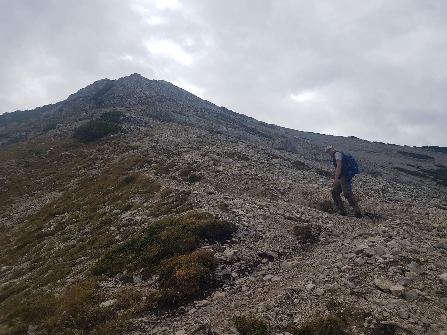 Hinter der Alm geht es weiter über einen Pfad kurz nach Nordosten und wenig später Richtung Süden, der Wegweiser ist interessanter Weise sehr bodennah. Zunächst führt der Weg durch lichten Wald, welcher durch die Latschenzone schnell abgelöst wird. Darauf folgt ein mit fels- und schuttdurchsetzes Gebiet, welches hoch zum Gipfel führt. Abgesehen davon, dass einige Teile vom Weg ausgespült sind, ist es ein toller Anstieg über den Rücken hoch zum Gipfelkreuz, von wo man einen tollen Rundumblick hat.