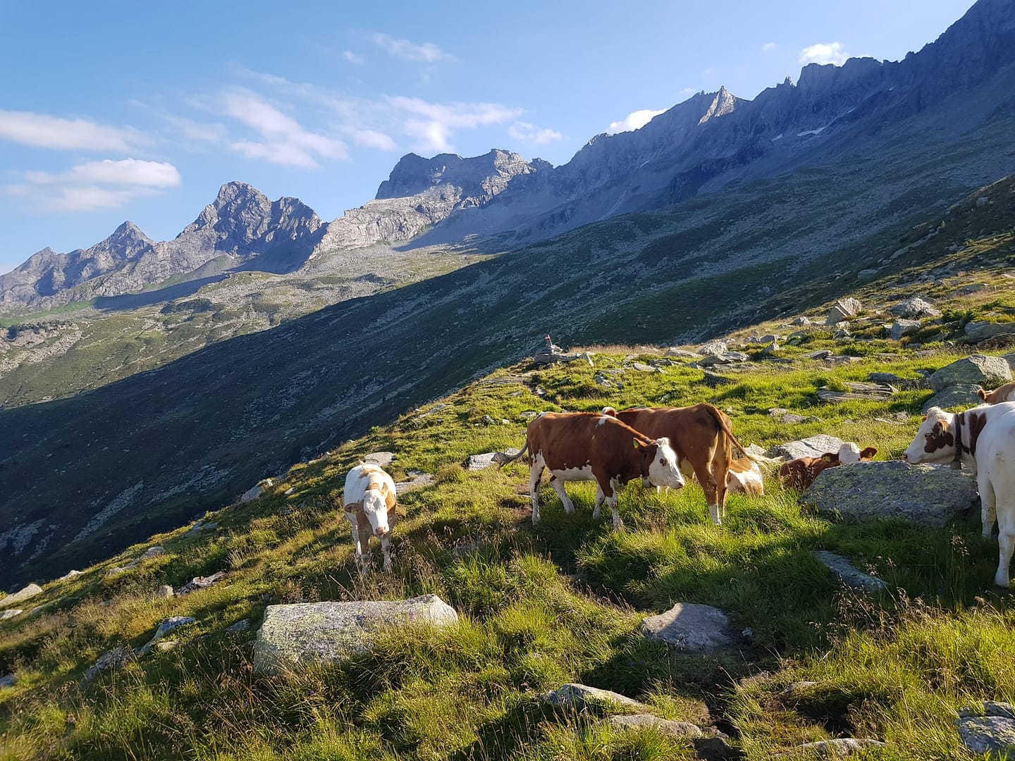Von der Kasseler Hütte geht es erstmals ein paar Höhenmeter runter Richtung Norden, den Wegweiser zur Edelhütte folgend, aus dem Stilluptal heraus. Nach ca. 800 m erreichen wir die Abzweigung, die ins Tal führt, wir bleiben aber auf dem Höhenweg und queren bald darauf den Sonntagskarbach, von wo der Steig wieder bis zur Sonntagskarkanzel ansteigt. Ein letzter Blick zur Kasseler Hütte und es geht weiter durch teilweise steile Grashänge und wegloses Felsblockgelände zum Stein- und Samerkars. Im stetigen Auf und Ab erreichen wir das Samerkarjöchl und schließlich das Weißkarjöchl, wo Kühe und Scharfe grasen.