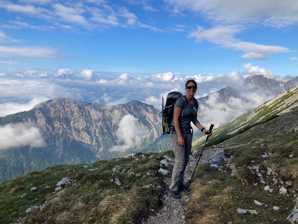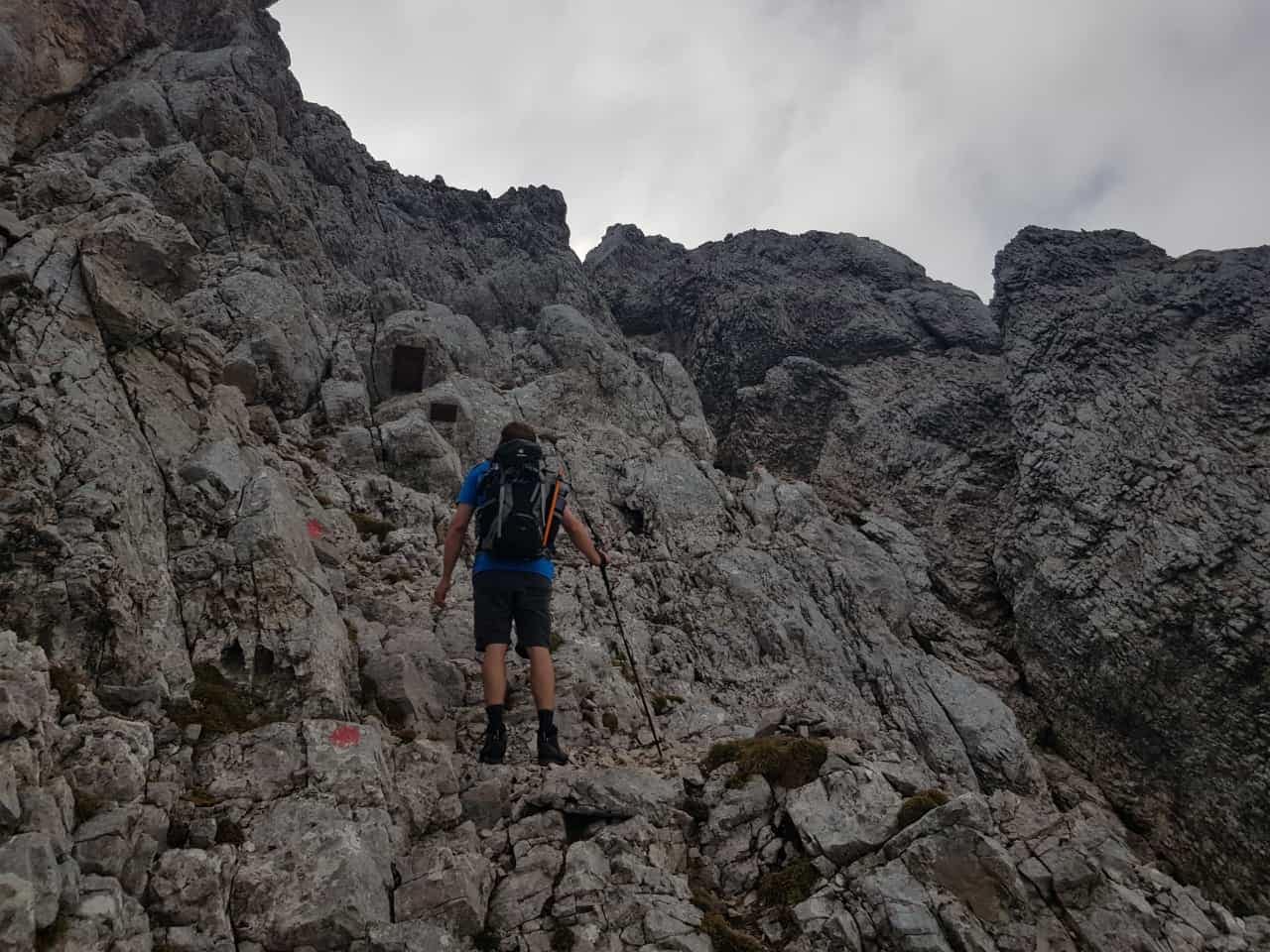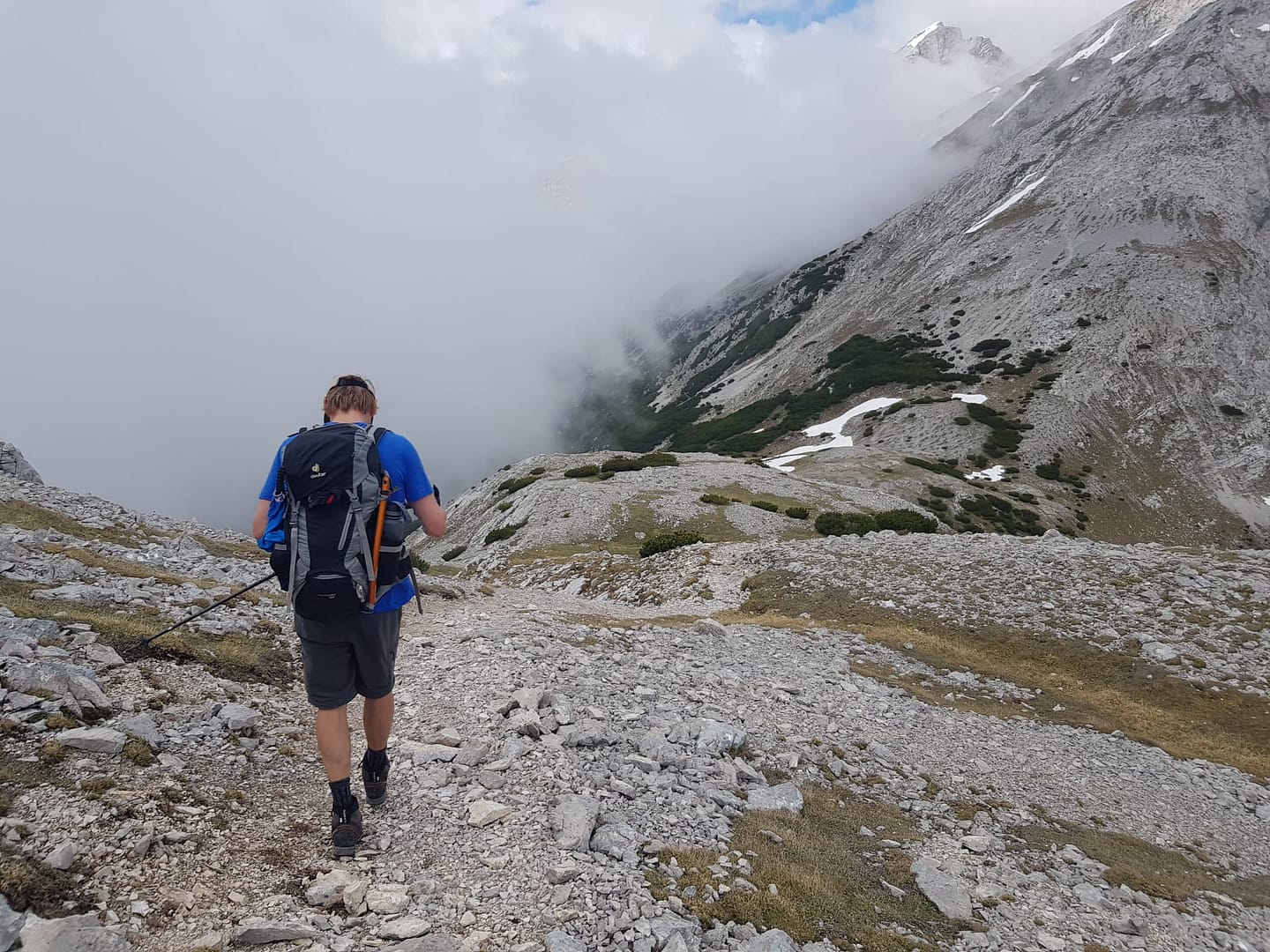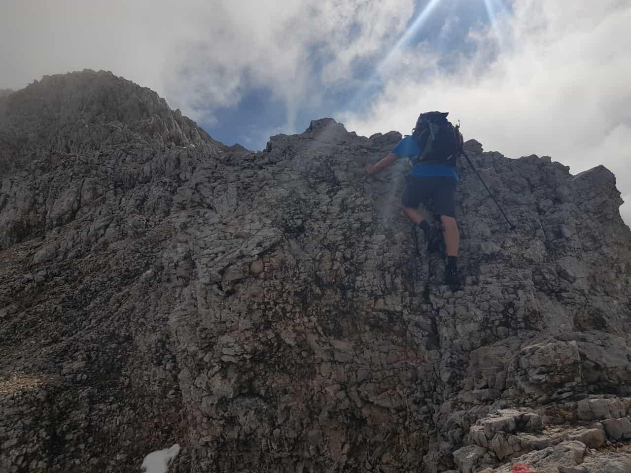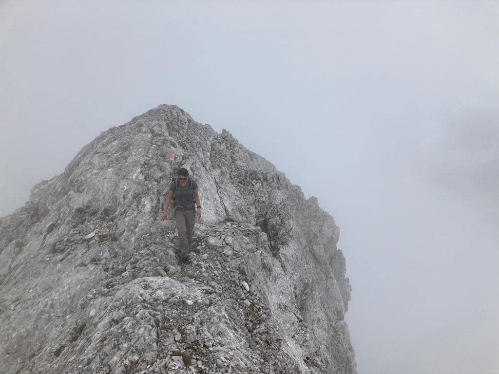 Es geht nun über den anfangs steilen, breiten, gerölligen Westrücken rauf bis zu einer flacheren Wiesenpassage und von dort über loses Gestein zu einer Rinne. Hier fängt die Kletterrei auf dem Verbindungsgrat zum Gipfel an. Total tolle und leichte Kletterei, aber auch sehr ausgesetz, also schwindelfrei und trittsicher sollte man definitiv sein. Oben angekommen hat man theoretisch einen fantastischen 360° Ausblick, wenn einem die Wolken keinen trich durch die Rechnung machen würden.