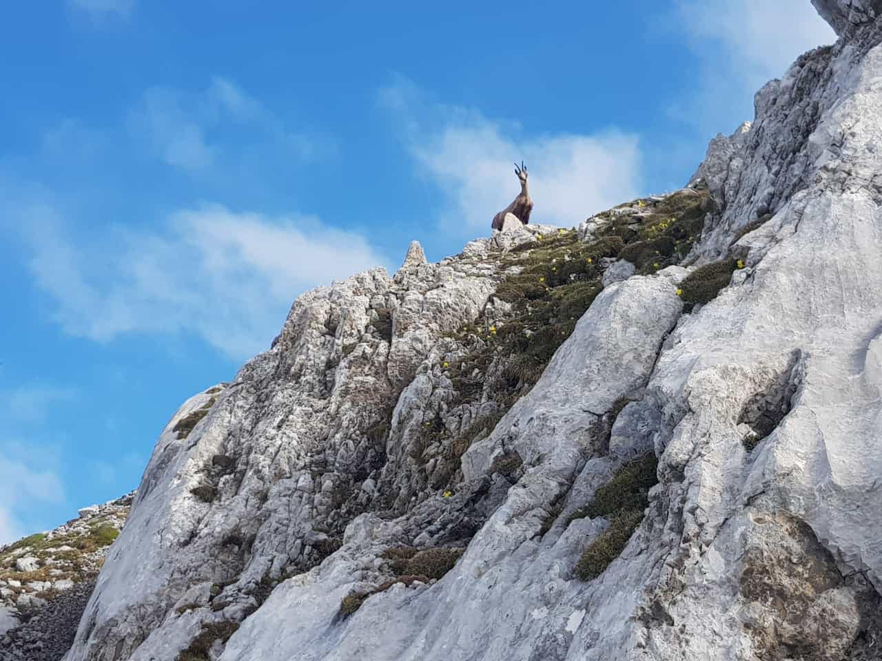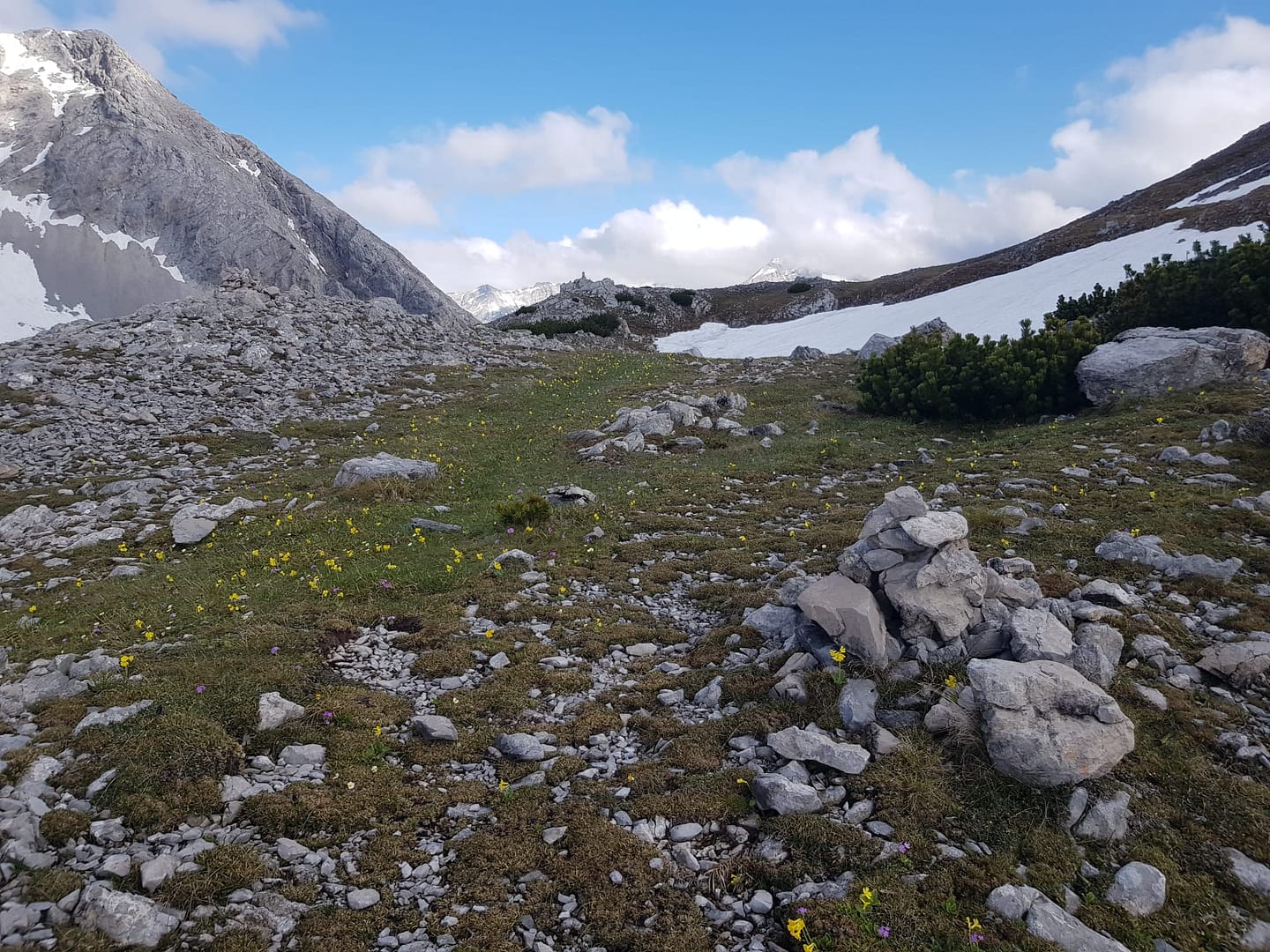 Nach dem Frühstück waren wir die Ersten die unterwegs waren und konnten die Gämse in alle Ruhe beobachten. Wir folgen dem Weg Nr. 222, im Glauben, dass der Weg in etwa auf derselben Höhe entlang der Südflänke der Speckkarspitze entlang quert. Dabei sind auch noch ein paar Altschneefelder zu queren, die in der Früh sehr glatt/rutschig waren. Überraschenderweise haben wir doch knapp 200 Höhenmeter zurück gelegt. Noch bevor wir das Lafatscher Joch erreichen zweigt ein Steig nach rechts zur Speckkarpspitze ab; wirklich gut markiert waren die ersten Metern nicht, nur aufgrund der Karte und ein weit entfernter Steinmann wussten wir dass wir richtig sind.