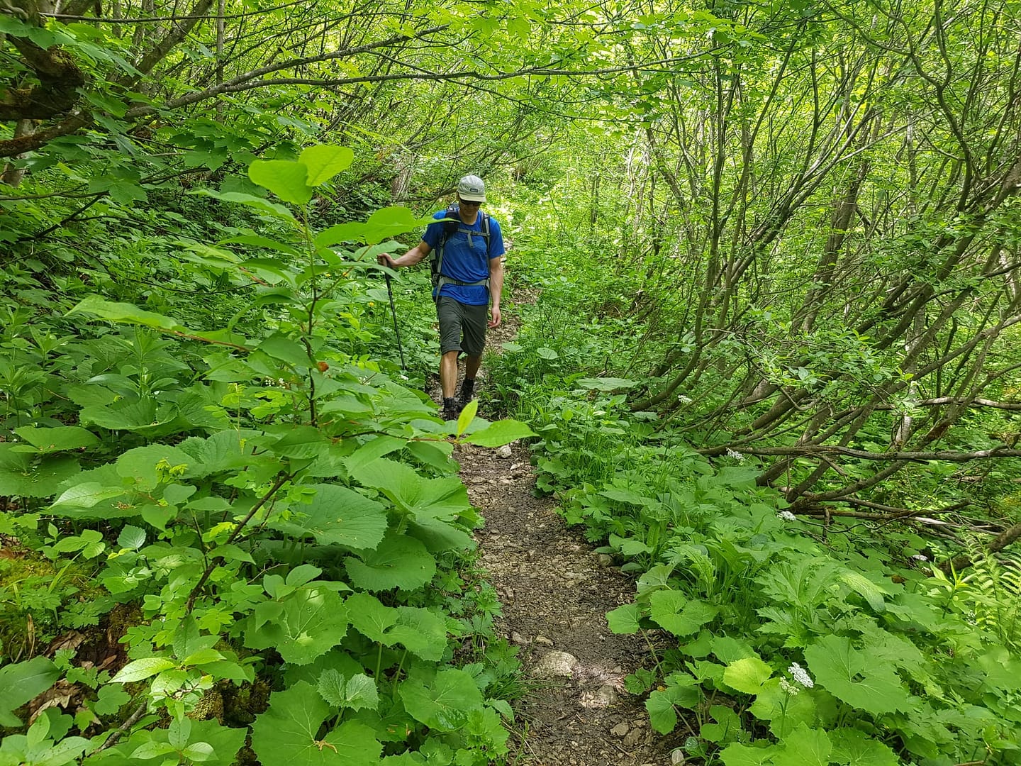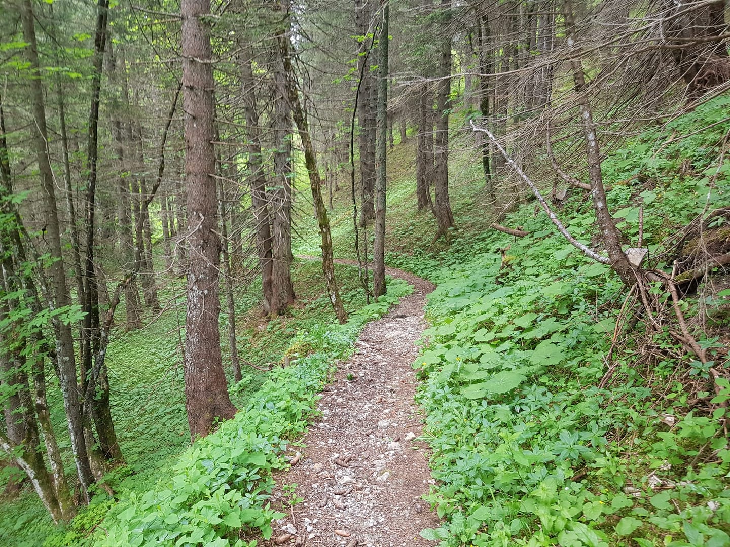 Vom Joch geht es auf einem breiten, gerölligen Weg durch Latschen Richtung Issanger auf ca. 1.620 m runter. Hier kann man auf dem Fahrweg bleiben, oder nach links über einen schmalen, teilweise steilen Steig, den Hirschbadsteig, durch den Wald hinab steigen – sehr zu empfehlen. Waldbestände, Wiesen mit schönen Blumen und ein etwas moorige Untergrund, der teilweise mit Holzplanken ausgelegt ist, schaffen einen tollen idyllischen Pfad. Ein Teilstück ist sogar so stark verwachsen, dass man sich vorstellen könnte in einem Dschungel unterwegs zu sein.