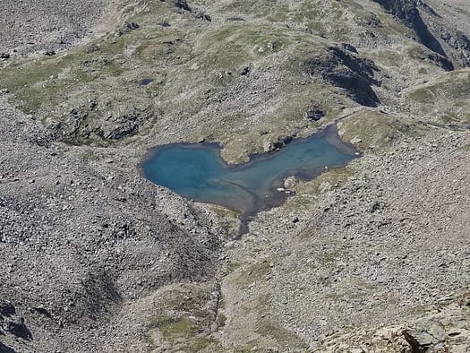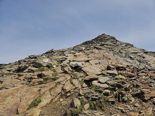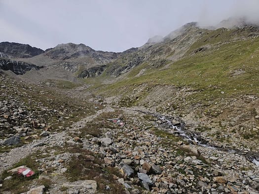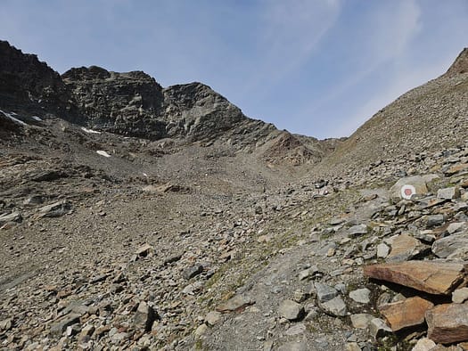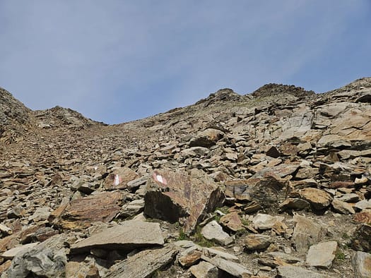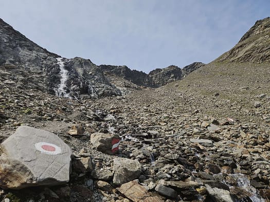 Nun beginnt die Fleißarbeit: Man umrundet einen Teil des Speichers auf dem linken Seeufer bis zum Südende, wo sich ein Wasserfall zeigt. Hier zweigt ein Weg zur Schweinfurter Hütte ab – man geht jedoch weiter taleinwärts. Dabei überquert man mehrfach den Wasserlauf, bis man unterhalb eines Wasserfalls ankommt. Der Weg ist sehr gut bis zum Gipfel markiert und angeschrieben.