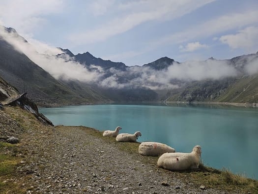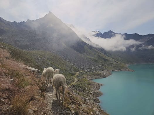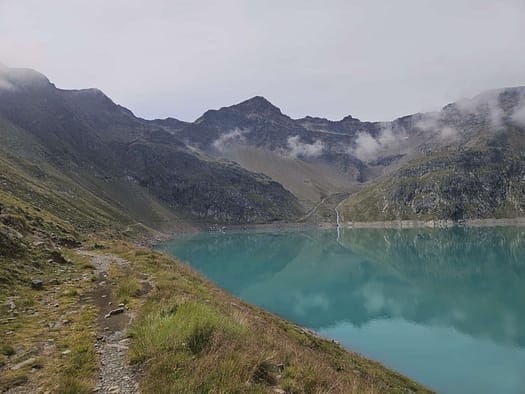 Am Speicher angekommen, bietet sich ein beeindruckender Blick auf die umliegenden Berge und das smaragdgrüne Wasser. Laut Outdooractive verläuft ein Pfad direkt entlang des Stausees – dieser ist jedoch gesperrt und nicht mehr begehbar. Ein alternativer Weg führt oberhalb, beim Sperrenhaus Finstertal (Kraftwerksgebäude), weiter. Ich habe diesen als Nächstes ausprobiert. Ein schmaler Pfad zieht sich weiter ins Tal hinein. Achtung: Ein gespanntes Netz dort ist extrem rutschig – hier muss man sich gut festhalten. Insgesamt ist dieser Weg nicht zu empfehlen. (Beim Rückweg habe ich stattdessen einen dritten, besser gangbaren Weg oberhalb gewählt.)