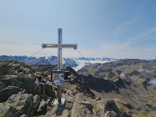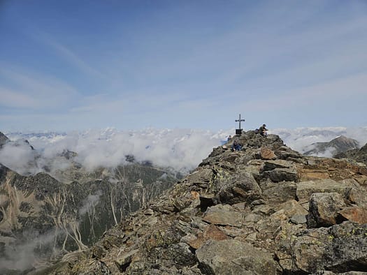 Die letzten Meter führen steil, aber technisch unschwierig, hinauf in eine unbenannte Scharte auf etwa 2.930 m – südlich des Gipfels. Von hier aus beginnt der breite Südrücken des Sulzkogels. Über Geröll und Blockwerk erreicht man schließlich das Gipfelkreuz auf 3.016 m und man kann den tollen Ausblick genießen. Rechts vom Hauptgipfel steht ein kleines Gedenkkreuz auf einem Nebengipfel.