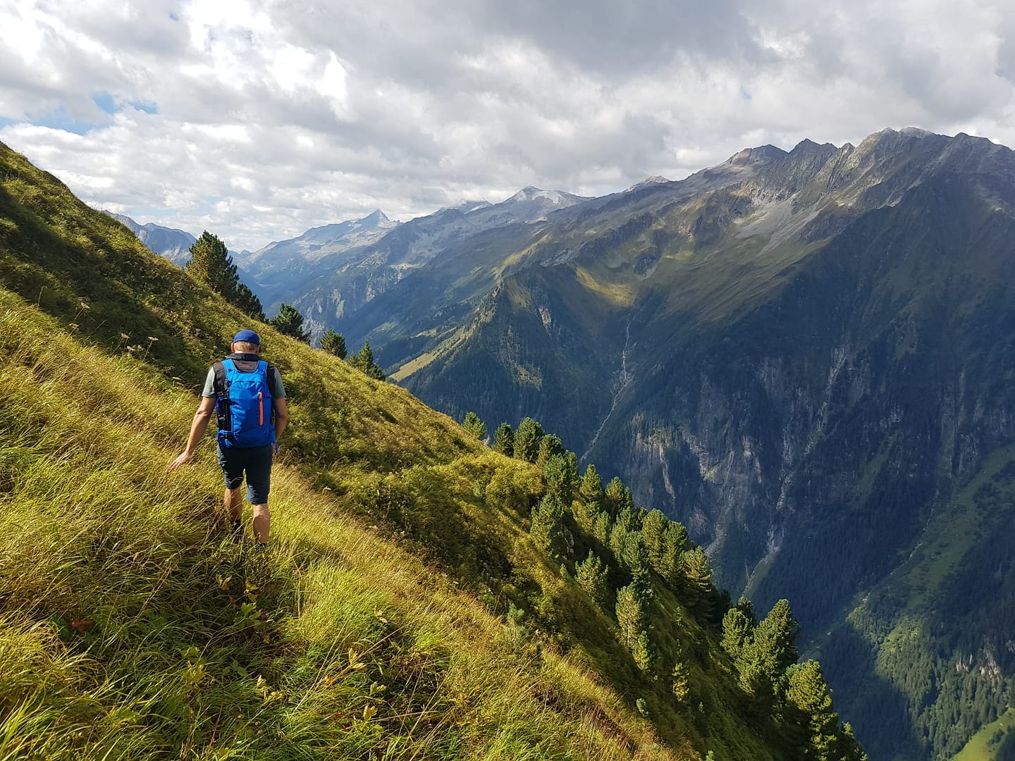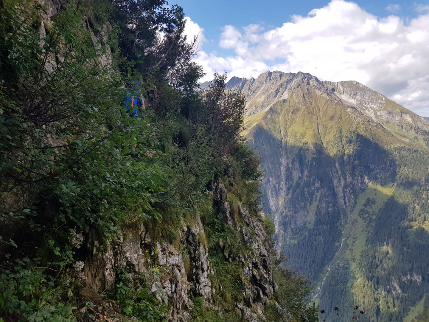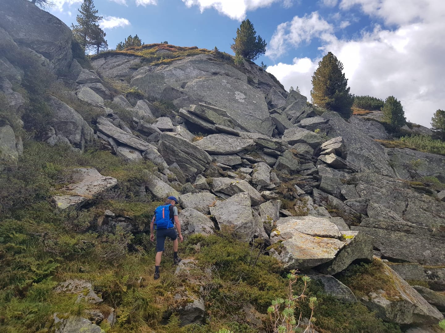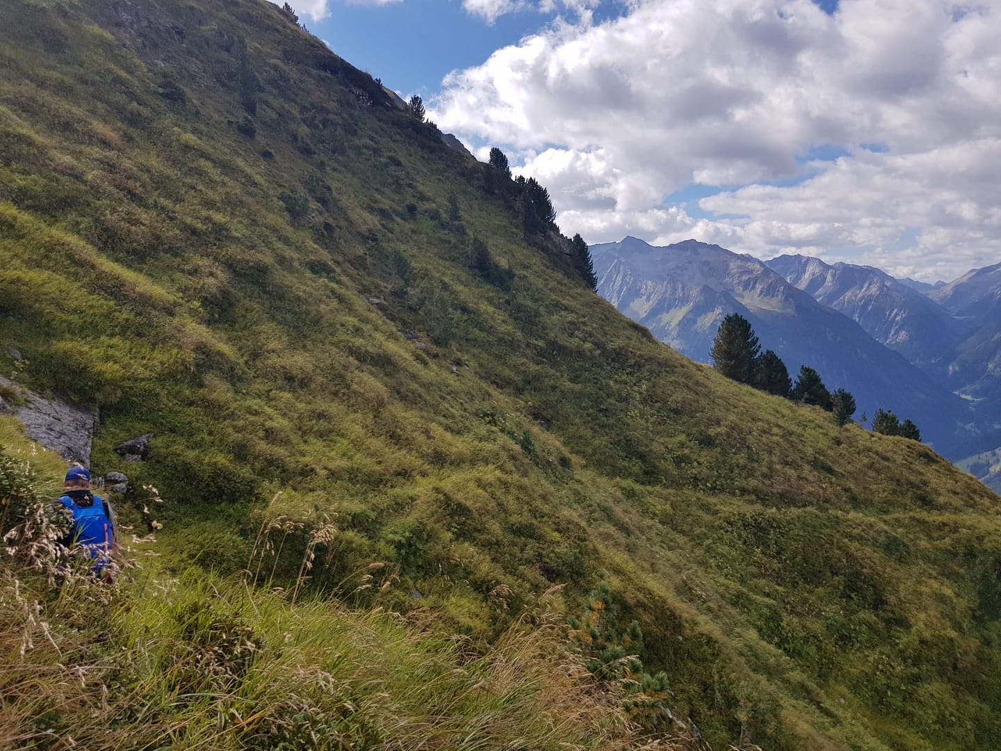 Nachdem wir uns ca. 1,3 km durch das Buschwerk gekämpft hatten, verlies uns die Motivation noch an diesem Tag auf den Gipfel aufzusteigen. Ein Paar Gämse sprangen die Wiese vom oberen zum unteren Weg runter und wir dachten nur noch „das machen wir nun auch“. Also sind wir ihnen über Gras, Stock und Stein zum unteren Weg gefolgt und runter gequert. An der Jagdhütte Wandegg kreuzt sich der Weg der von Ginzling hochführt, welchen wir schlussendlich abgestiegen sind.