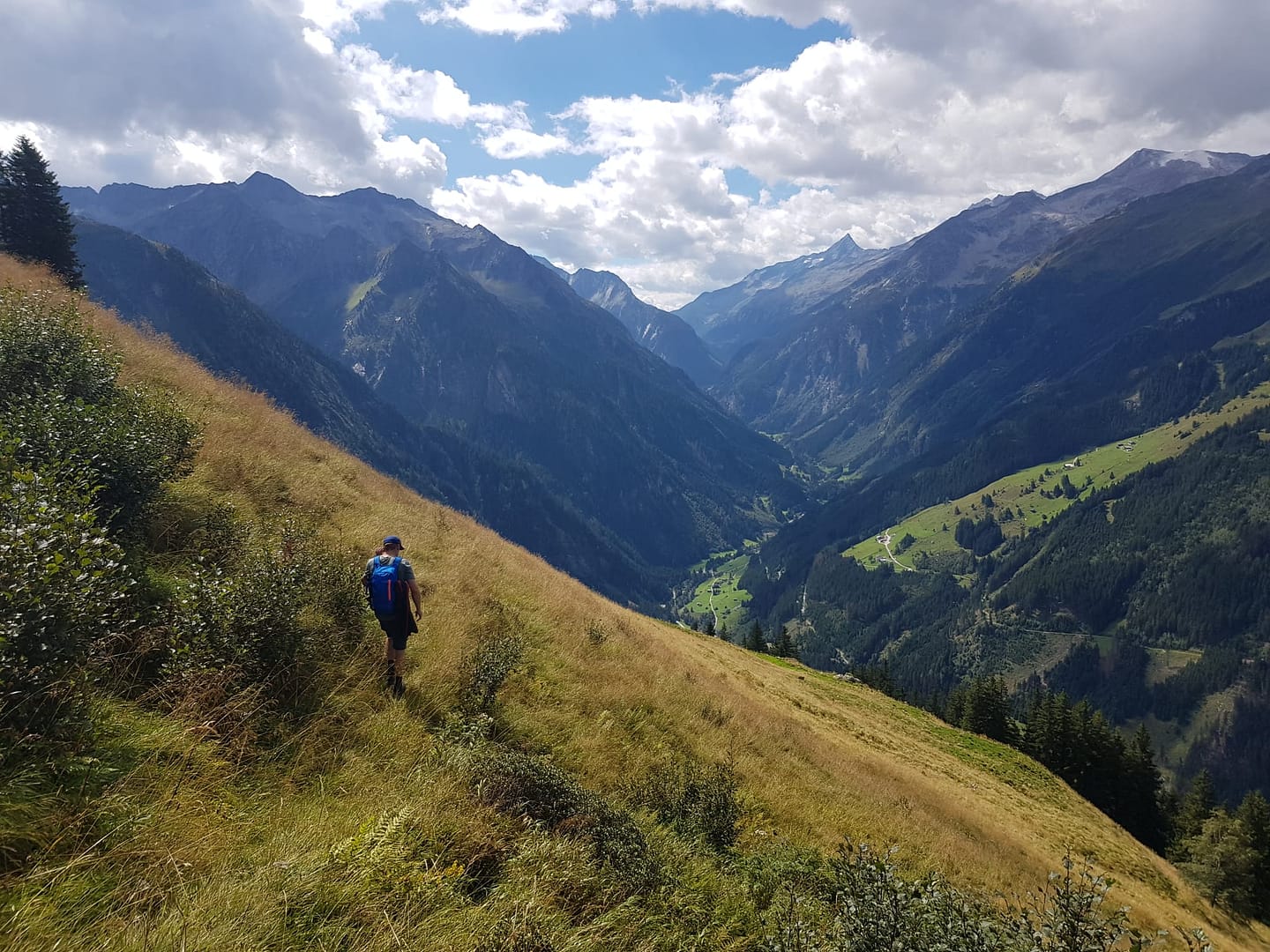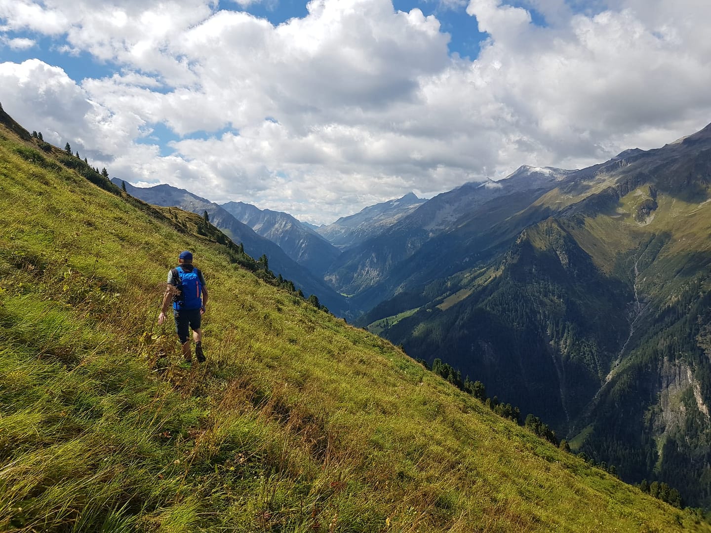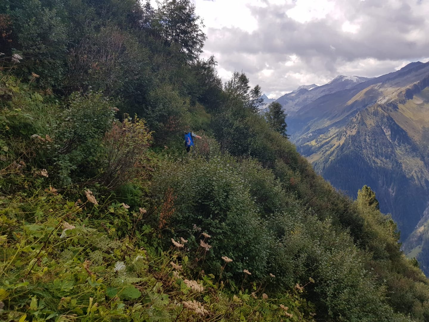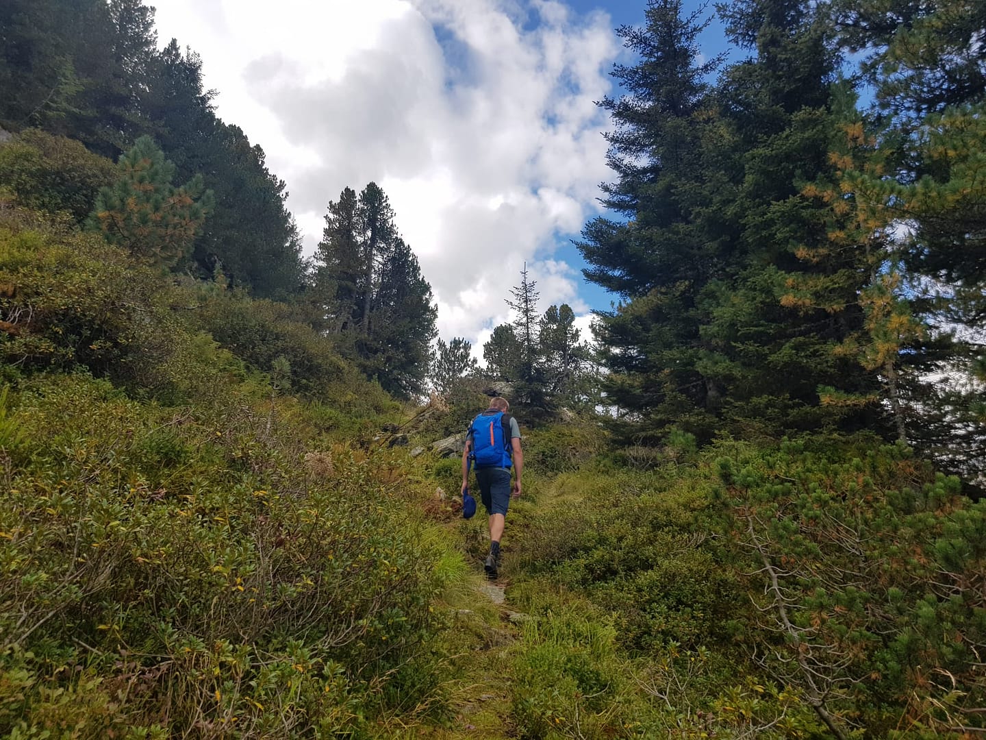 Nachdem wir uns ca. 1,3 km durch das Buschwerk gekämpft hatten, verlies uns die Motivation noch an diesem Tag auf den Gipfel aufzusteigen. Ein Paar Gämse sprangen die Wiese vom oberen zum unteren Weg runter und wir dachten nur noch „das machen wir nun auch“. Also sind wir ihnen über Gras, Stock und Stein zum unteren Weg gefolgt und runter gequert. An der Jagdhütte Wandegg kreuzt sich der Weg der von Ginzling hochführt, welchen wir schlussendlich abgestiegen sind.