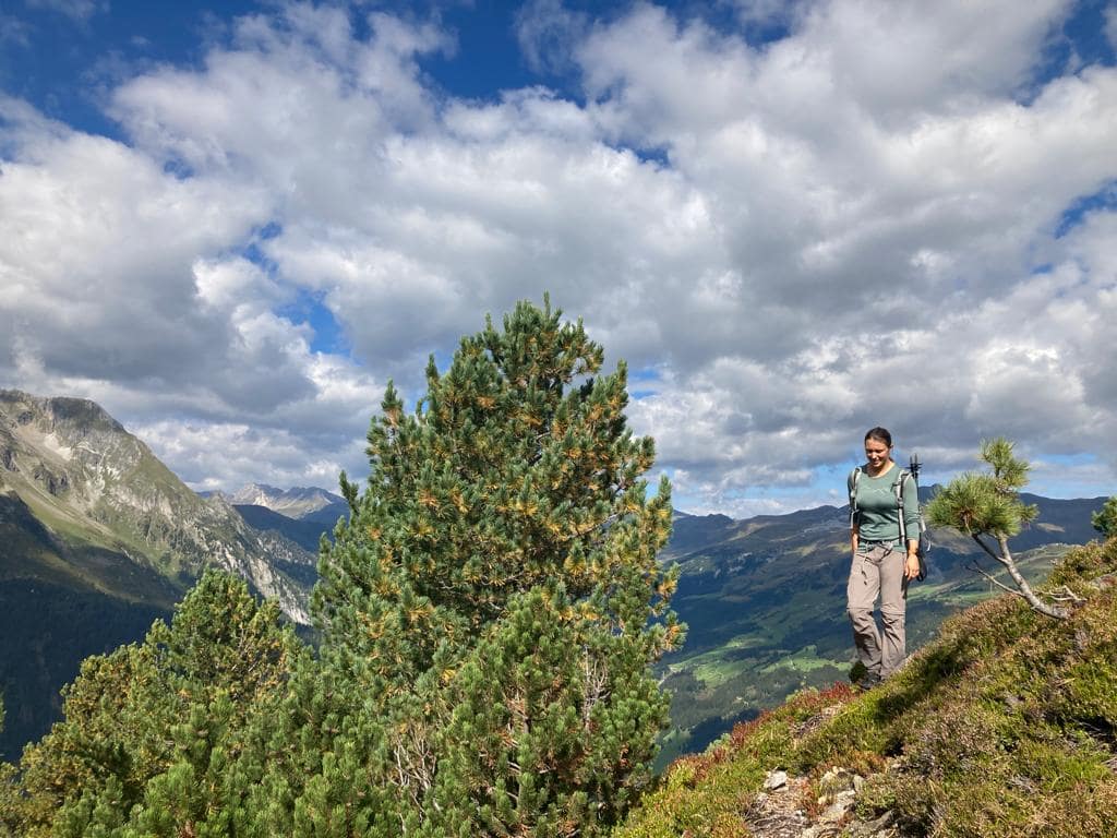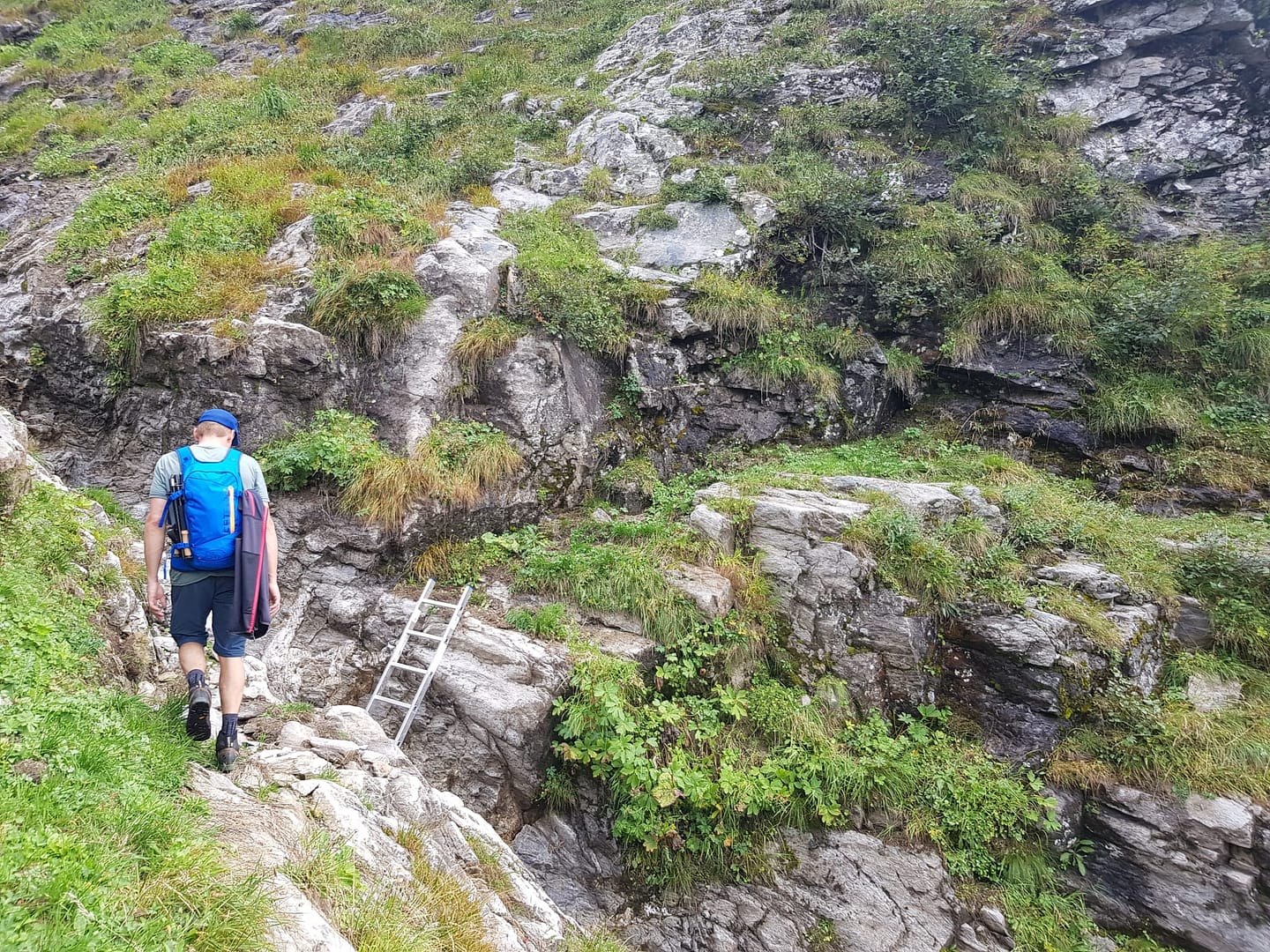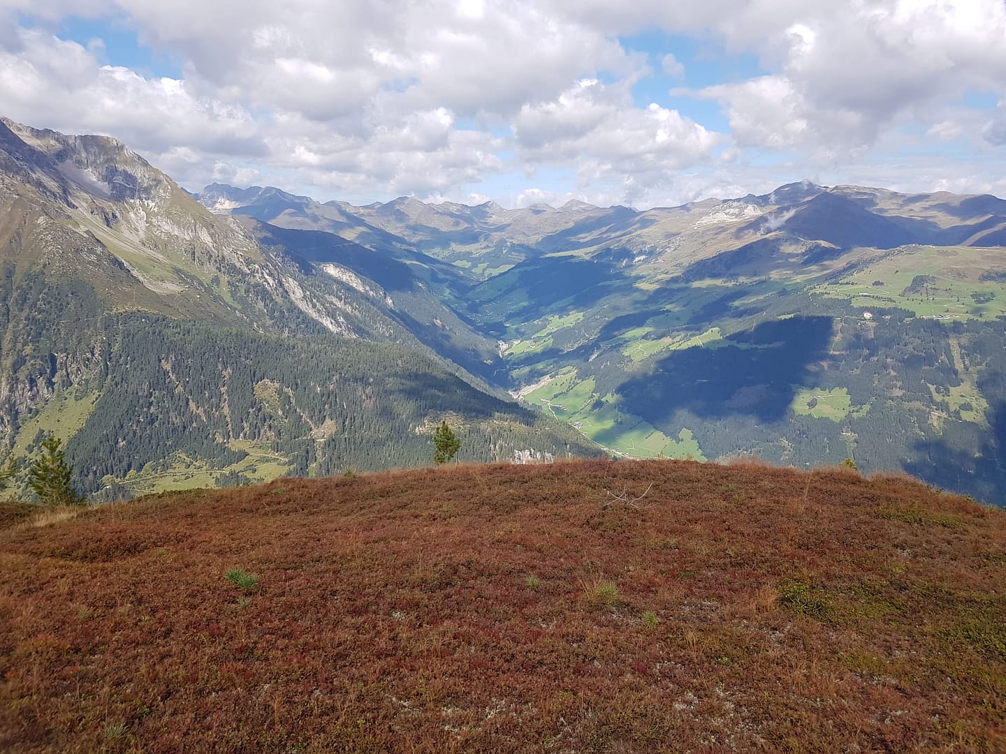 Die Ahornalm erreichen wir auf 2.000 m, diese hinter uns gelassen säumen einige Felsblöcke den weg und nach weiteren paar Höhemeter verlassen wir den eigentlich Weg, wir gehen direkt auf dem Grat zum Tristnereck zu. Auf dem Plateau hat man einen wunderschönen Ausblick auf die verschiedenen Täler rundherum. Auf 2.230 m stehen wir vor einer großen Wand, die mit einer II-Kletterei überwunden werden kann. Die ausgesetzte Felsplatte war uns aber aufgrund des vorigen Regens zu nass und rutschig, so dass wir hier unseren Plan A verworfen haben.