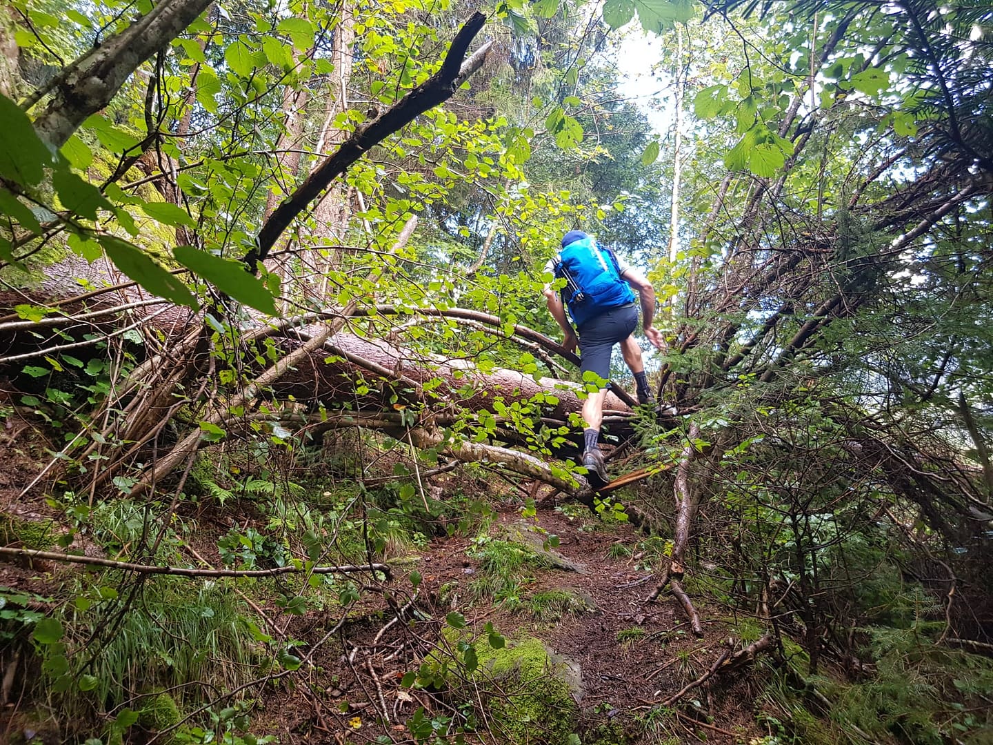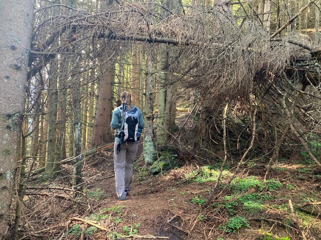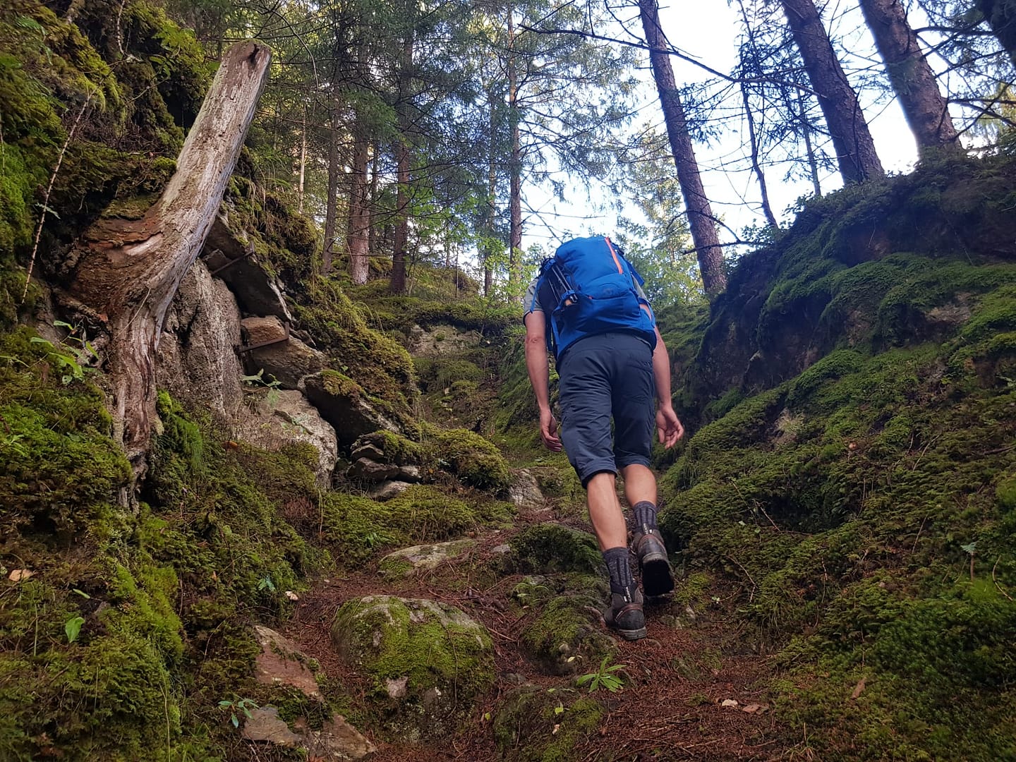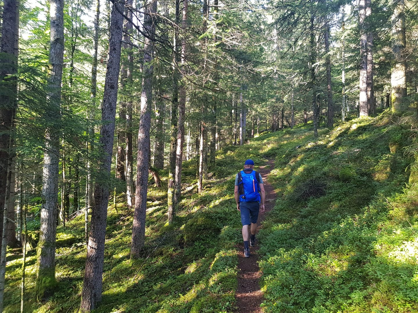 Der Pfad ist besser gepflegt als erwartet, also nicht so zugewachsen, Moos und die verschiedensten Pilze in allen Formen, Größen und Farben säumen den Weg. Es gibt einige Tierpfade, die einem von Weg ablenken können, also achtet am besten immer auf die „Wegmarkierungen“ in Form von Steinen mit Zahlen. So schlängelt sich der Pfad durch den Wald nach oben zur unteren Harpfneralm.
