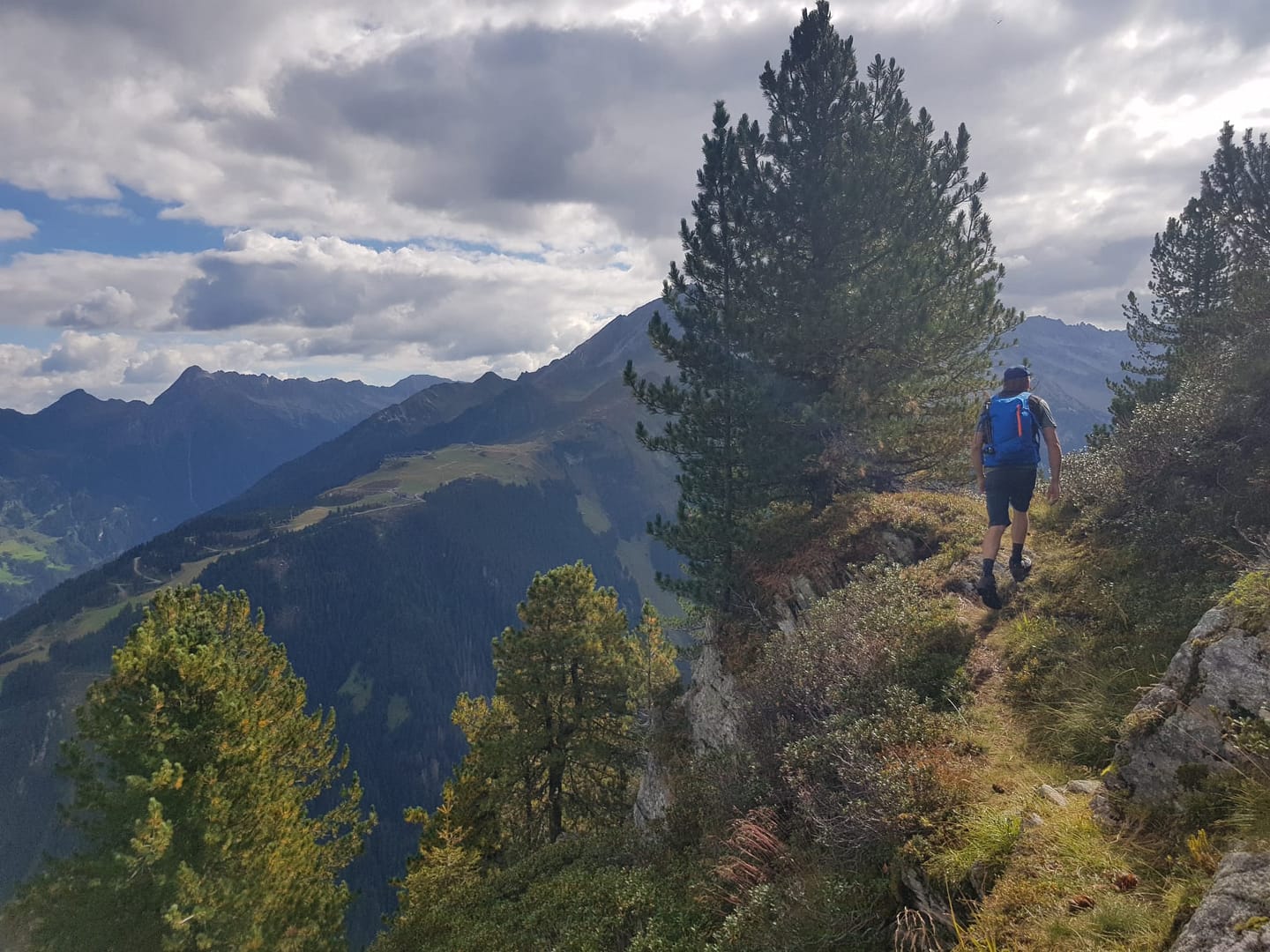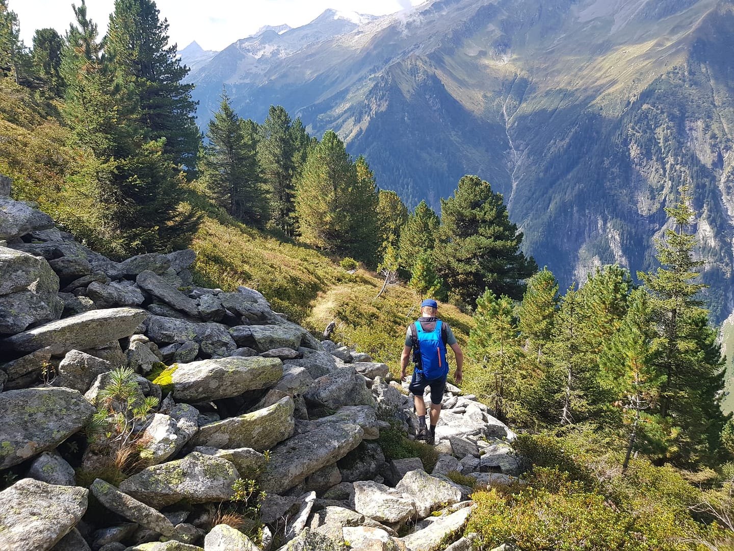 Bei den Wasserkraftwerken in Mayrhofen starten wir in der Stillupklammstraße. Am Ende (Sackgasse) führt ein schmaler Pfad zwischen dem Holzhaus und dem Wohnhaus hindurch. Das ersten Höhenmeter kommen einem sehr steil vor, da aber der ganze Weg nicht wirklich anders wird, gewöhnt man sich dran. 😉