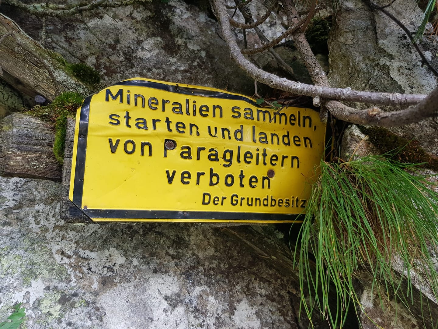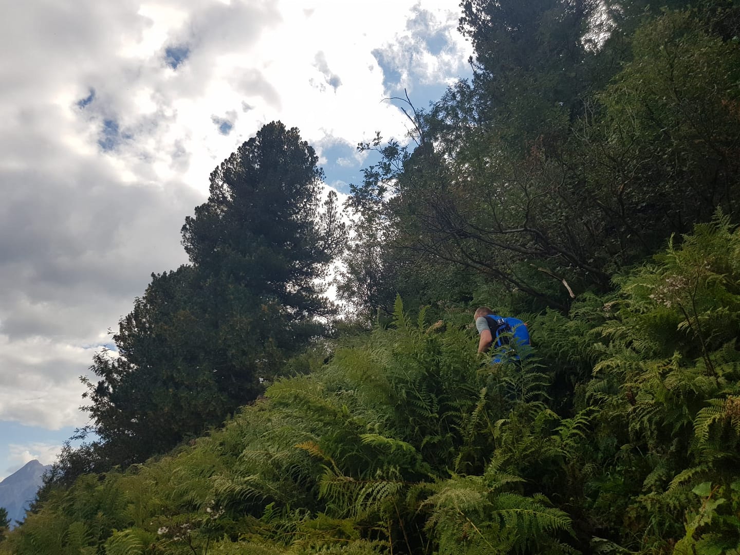 Nach ca. 8,3 km auf 2.060 m verloren wir dann gänzlich den Weg, alles war so zu gewachsen, das wir etwas ratlos überlegten, ob wir nicht doch umkehren sollten, jedoch war der Grashang auch nicht so der Lichtblick. Durch das Gebüsch wühlend, an Grashalmen und dünnen Ästen festhaltend bahnten wir uns dann doch einen Weg durch das Gestrüpp runter zu einem Bach. Diesen überquerend sahen wir ein, in unsren Augen sinnloses, Schild auf einem verwachsenden Felsband, wo der „Pfad“ sich fortsetze.