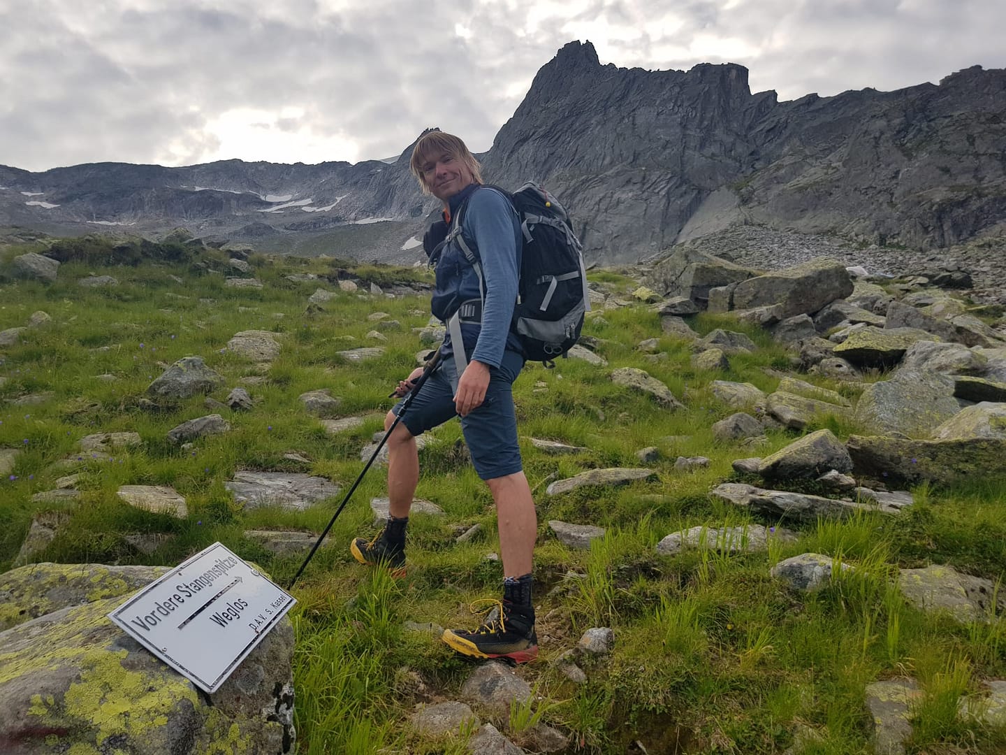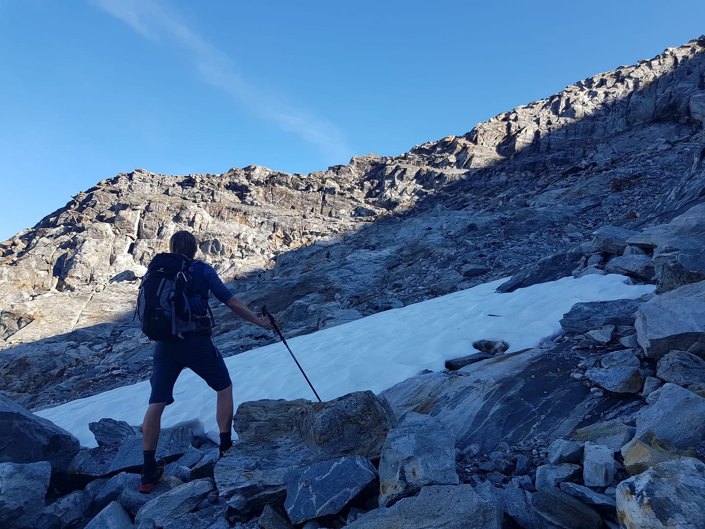 Von der Hütte folgen wir dem Wegweiser Richtung Sonntagskar, schon nach ca. 500 Metern kommt nochmal ein Schild „Vordere Stangenspitze“, welches nach rechts weglos durch das felsige Blockgelände nach oben führt. Die ersten ca. 400 Höhenmeter halten wir uns weiter rechts, da es gut zu gehen geht, erst auf ca. 2.680 m steuern wir das Firnfeld unterhalb des Gipfels an.