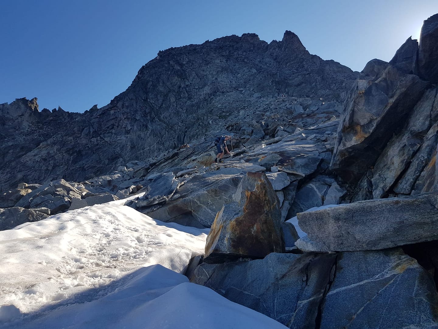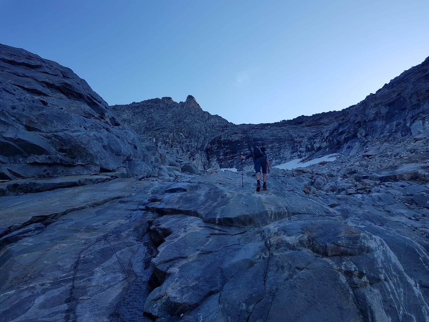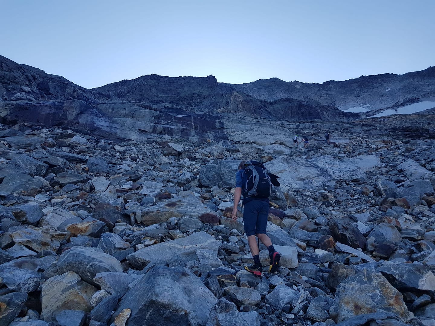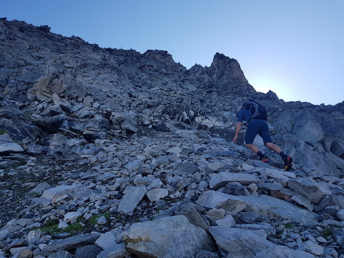Auf. 2.930 steigen wir auf den Westgrat rauf und klettern (UIAA I) durch die Flanke bis zum Gipfel. ACHTUNG: im oberen Bereich solltet ihr euch eher links halten, dort stehen auch Steinmänner, wir sind etwas vom Weg abgekommen und waren zu weit rechts und dort war es etwas schwieriger zu klettern.
