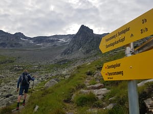 Von der Hütte folgen wir dem Wegweiser Richtung Sonntagskar, schon nach ca. 500 Metern kommt nochmal ein Schild „Vordere Stangenspitze“, welches nach rechts weglos durch das felsige Blockgelände nach oben führt. Die ersten ca. 400 Höhenmeter halten wir uns weiter rechts, da es gut zu gehen geht, erst auf ca. 2.680 m steuern wir das Firnfeld unterhalb des Gipfels an.