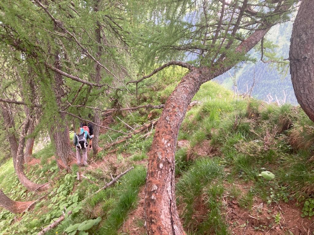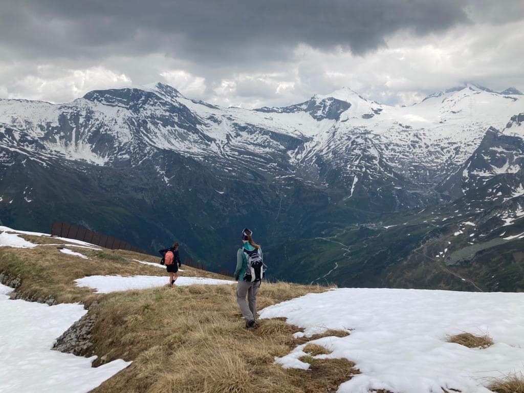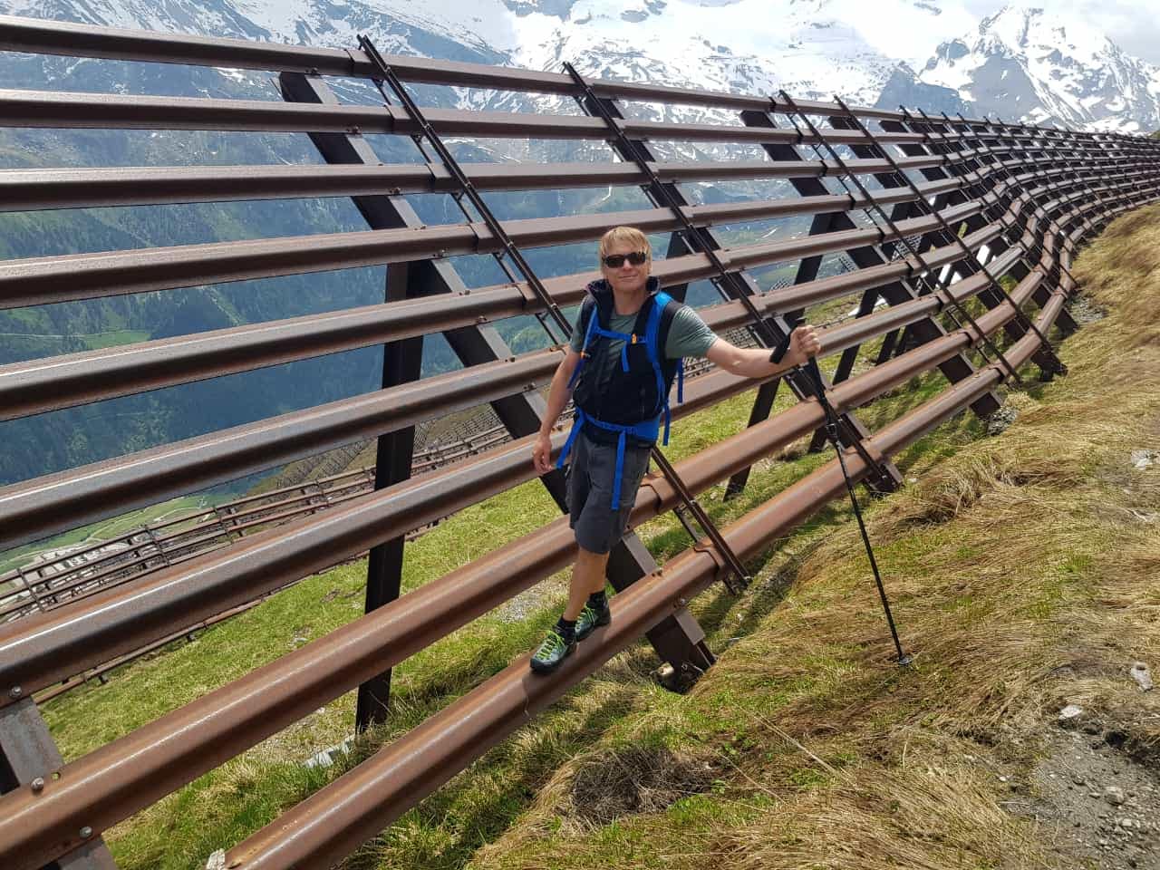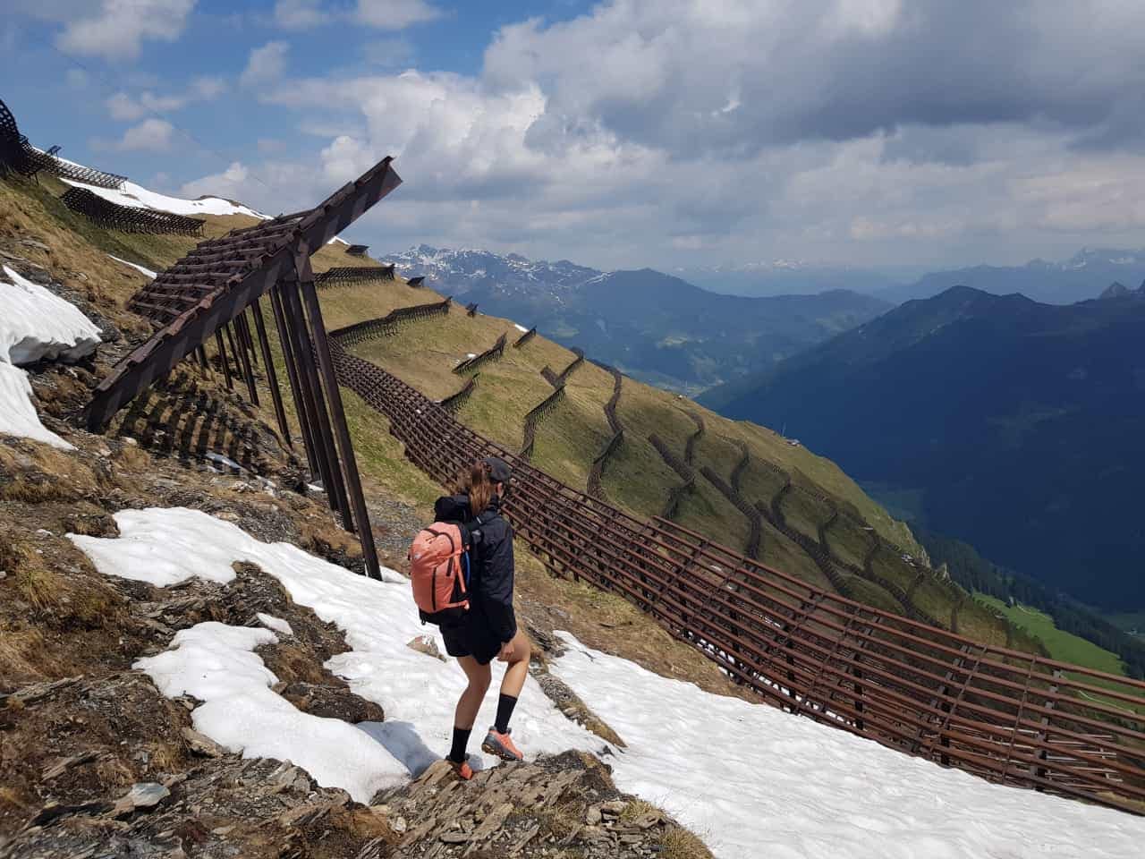 Bei der Wandspitze waren wir dann auch etwas verloren, denn einen Pfad runter haben wir (wahrscheinlich auch aufgrund vom Altschnee) nicht wirklich enddeckt. Also erst einmal Querfeldein an den Lawinenverbauungen auf 2.470 m runter. Ab hier war ein Trampelpfad erkennbar und auch Wegmarkierungen weisten den Weg zwischen den Hang mit den zig Lawinenverbauungen hin durch, mal drunter kletternt, mal dazwischen absteigend, entlang.