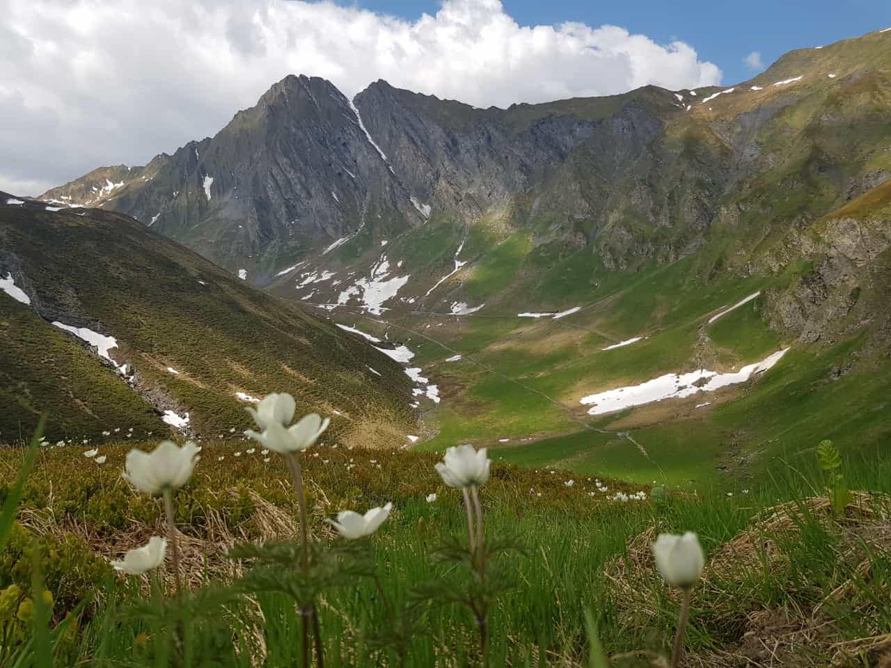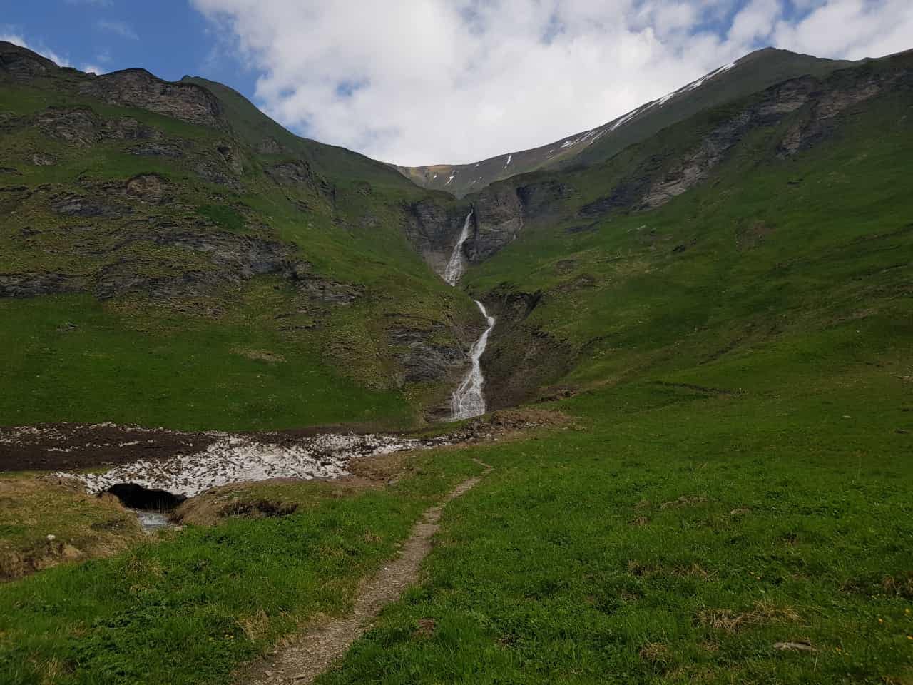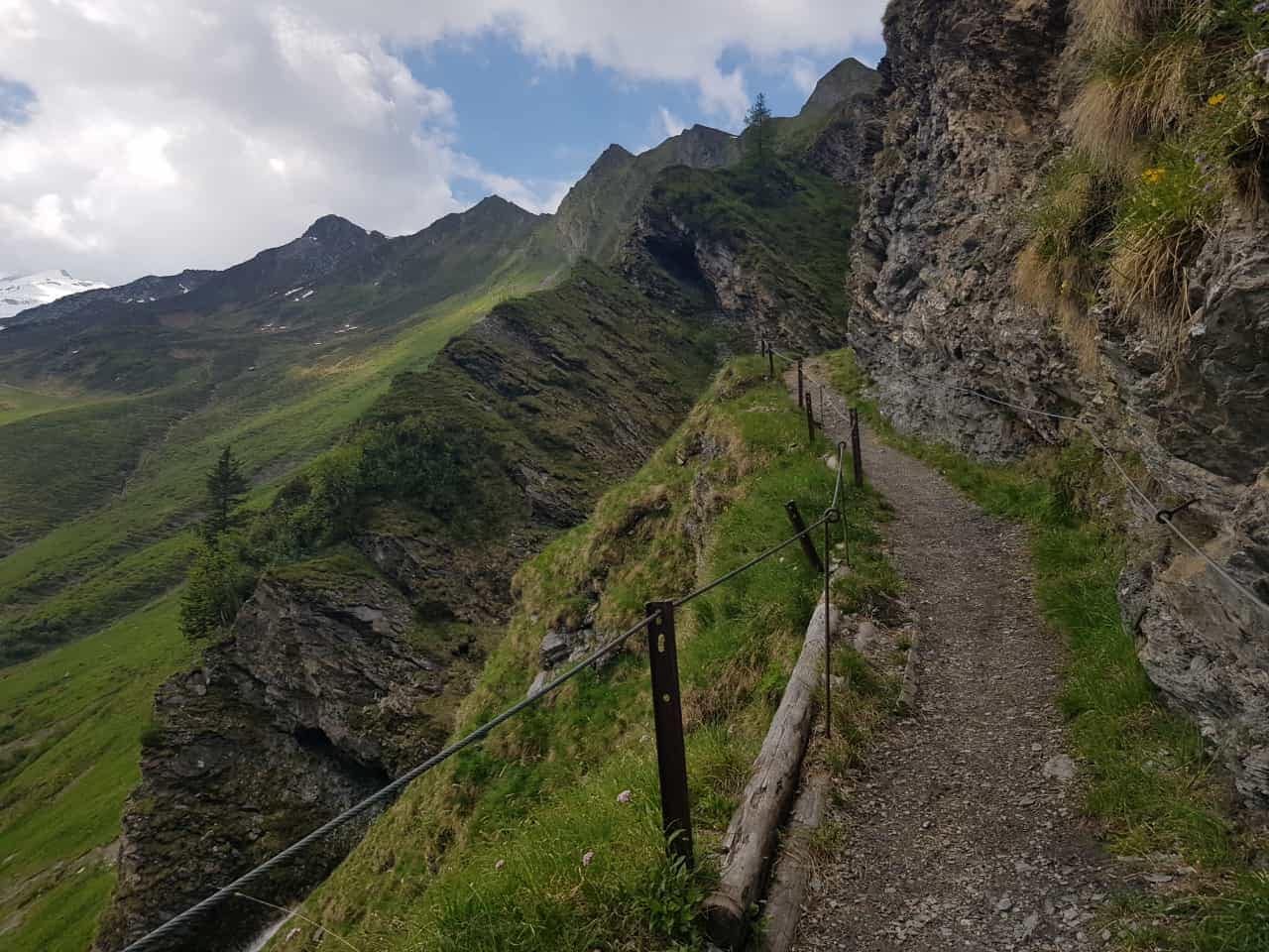 Der Schleierfall ist wunderschön und allgemein war die Landschaft sehr idylisch an zu sehen. Oberhalb vom Wasserfall wird es etwas abschüssig, aber schon bald erreichen wir das Weitenal. Hier findet wir noch einen großen Lawinenausläufer vor, halten uns aber rechts, wo es in Serpentinen den Hang hinauf geht. Schafe grasen friedlich auf der Wiese und wenig später hüpft auch eine Gams in unser Blickfeld. Ein paar Kehren weiter sehen wir dann auch eine Herde von Gämsen – einfach beeindruckend die Tiere zu beobachten und die Landschaft zu genießen.