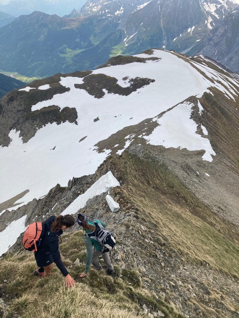 Achtung auf 2.560 m haben wir uns dann aufgrund von Altschnee verstiegen und und sind einfach direttissima auf einen Grat rauf. Natürlich waren wir dann ein gutes Stück zu hoch und haben auf unser eigentlich Ziel den Gipfel der Wandspitze runtergeblickt. Irgendwie hat das der Tour noch die gewisse Würze gegeben, wir sind am Grat runtergeklettert und dann zum Gipfel abgestiegen.