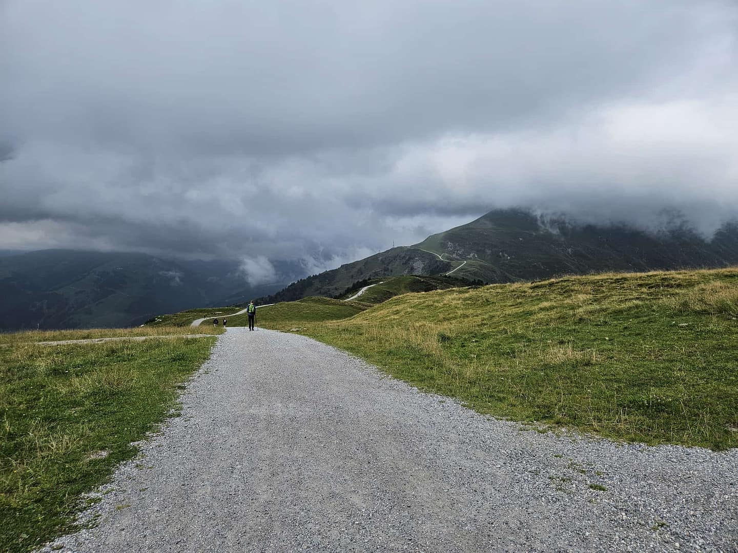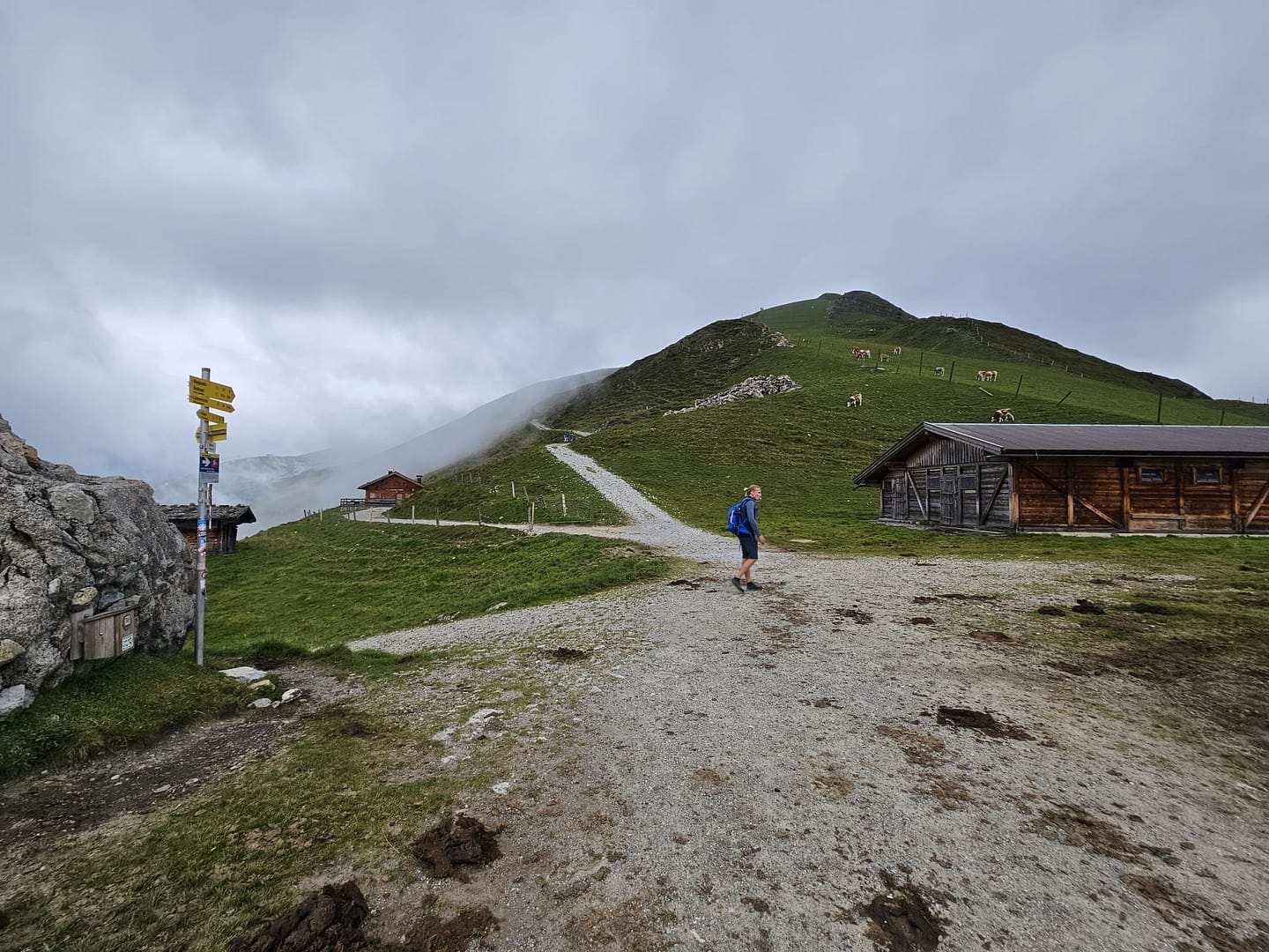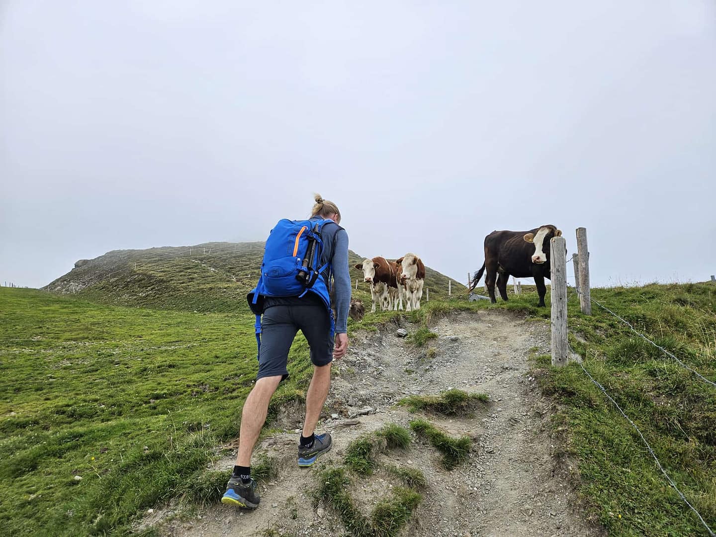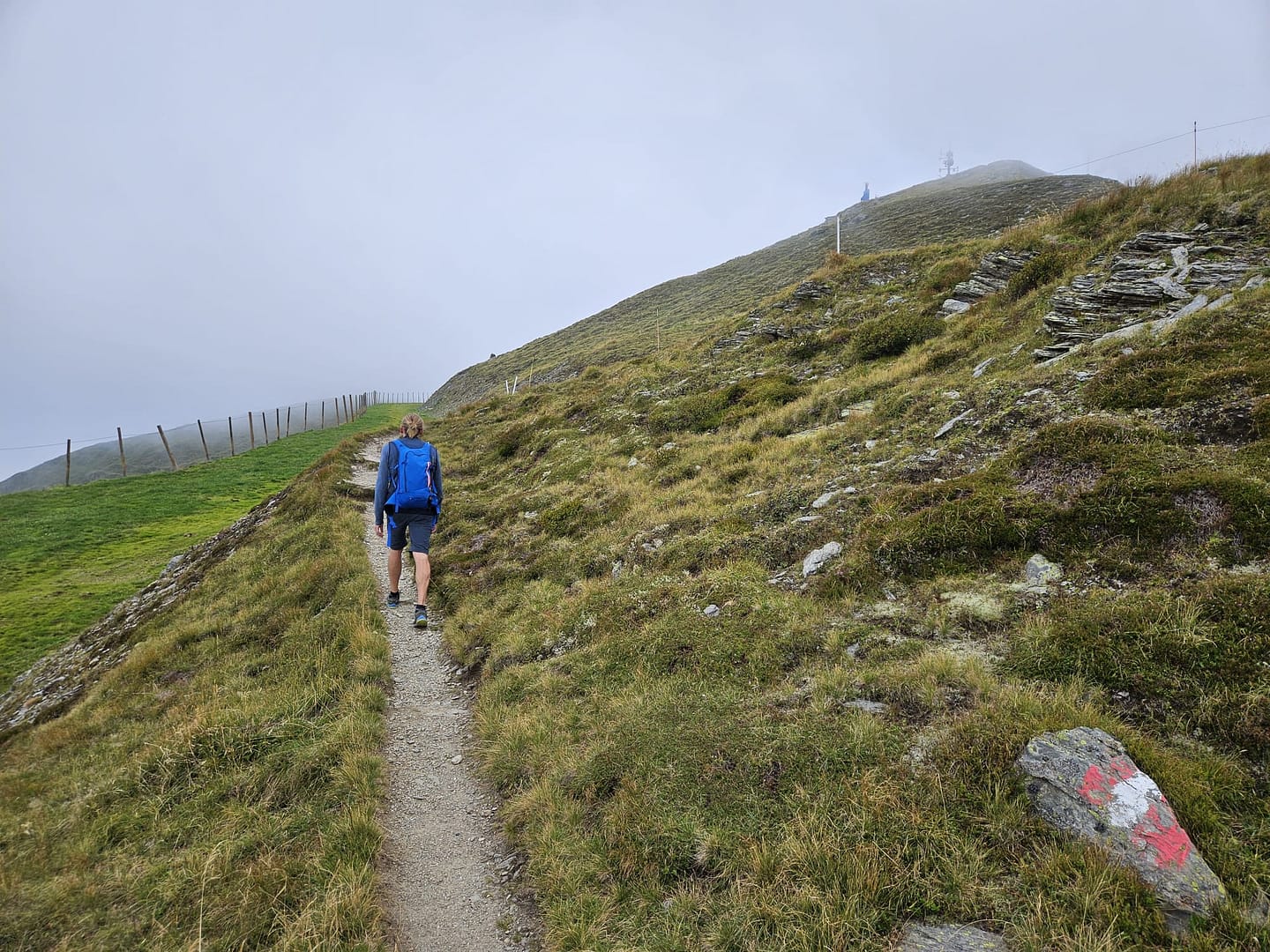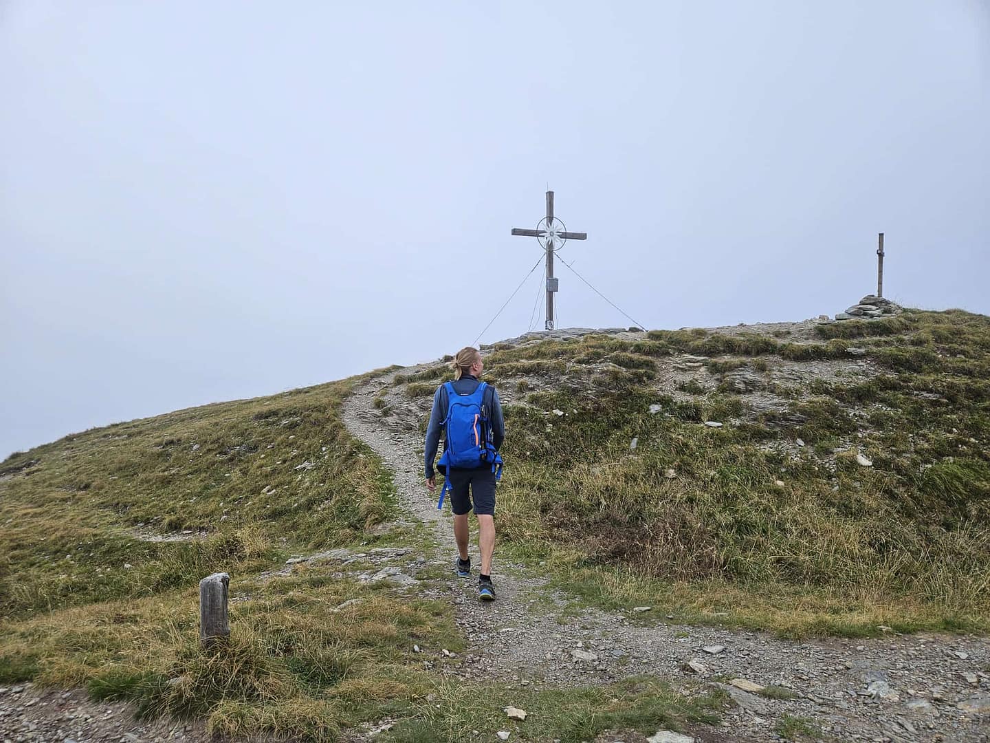 Hier ändert sich der Charakter des Weges: Auf 2.185 Metern Höhe wird der einst breite Wanderweg zu einem schmalen Pfad, der sich kurvenreich durch die Almwiesen schlängelt. Vorbei an grasenden Kühen, steigt der Weg allmählich an. Es ist schwer, die Anzahl der Weidezaunkreuzungen mitzuzählen, aber diese kleinen Hindernisse verleihen der Tour ihren eigenen Reiz. Nach etwa einer Stunde erreichen wir schließlich das Gipfelkreuz. Leider bleibt uns bei diesem Wetter die Aussicht verwehrt. Der Abstieg erfolgt auf demselben Weg.