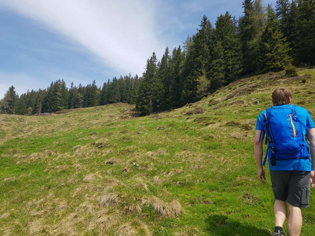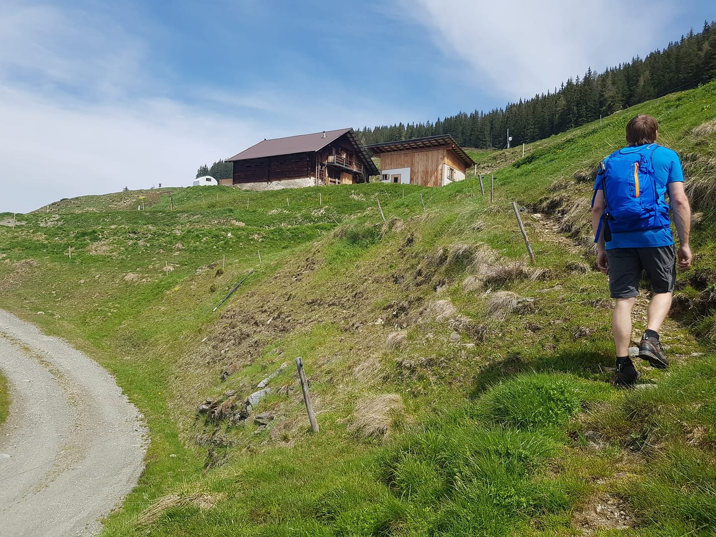 Nach ca. 70 Höhenmeter kommt von links ein zugewachsener Forstweg rauf, auf welchem wir weiter nach rechts folgen (Webweiser weisen den Weg). Diesen Weg folgen wir bis zur ersten Hütte. Hier hat man die Möglichkeit auf der Straße weiter zu laufen (Beschilderung) oder links an der Hütte vorbei direkt auf die Almwiese.