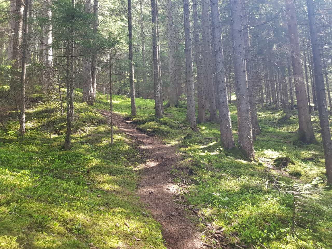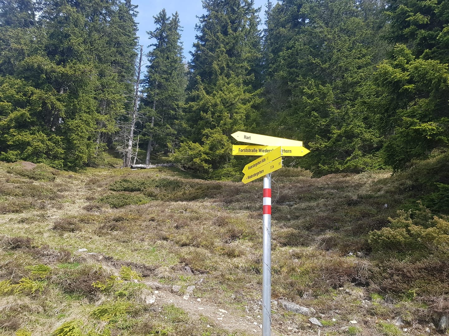 Nun zur Tour: Wir starten auf der Straße und folgen dieser in gemäßigter Steigung ca. 110 Höhemeter hoch. Bei der letzten Hütte queren wir die Wiese (4. Bild) zu der freistehenden Baumgruppe, hier gibt es auch schon die nächsten Wegweiser. Dort gehen wir rechts herum und auf den Wald zu (5. Bild). Der Waldboden ist mit Blaubeerensträucher gesäumt, vllt kommen wir im Sommer wieder zum Pflücken. Auf 1.220 m kommen wir an eine Forststraße, rechts ist eine Sackgasse mit einem Hinweis „kein Durchgang“ und auch einer Schranke, wir gehen einfach weiter geradeaus und folgen weiter dem Pfad hinauf durch den Wald.