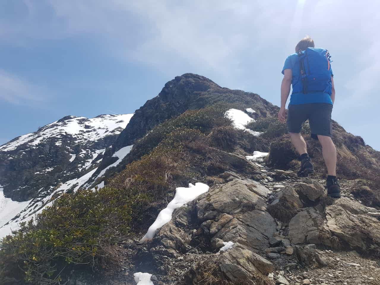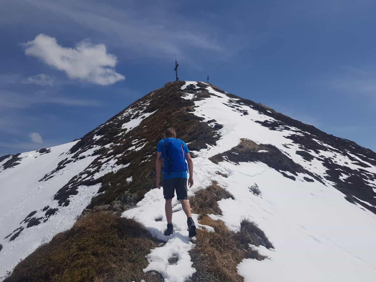 Auf ca. 1.810 m sieht man in der Ferne schon den Gipfel (1. Bild), hier erreichten wir dann auch die ersten Altschneefelder, welche man teilweise ausweichen konnte. An der Wegkreuzung kann man den Gipfel auch auf dem Panoramaweg umgehen, wir folgen aber dem Pfad weiter über den Grat hinauf. Bis hier hin waren wir noch in kurzen Gewand unterwegs, aber am Grat selbst hat und der Wind um die Ohren geblasen.