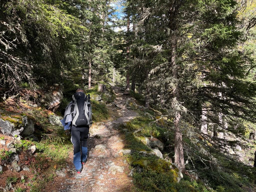 Ab der Siedlung Winnbach folgt man weiter der Beschildung, nach ca. 140 Höhenmeter auf einem breiten Karenweg erreicht man die nächste Abzweigung. Alleine schon auf diesem kurzen Stück hat man einen tollen Ausblick auf die Berge ringsrum, genießt es. Bei der Abzweigung geht es in nordwestlicher Richtung über einen schmaleren Pfad durch den Wald weiter aufwärts.