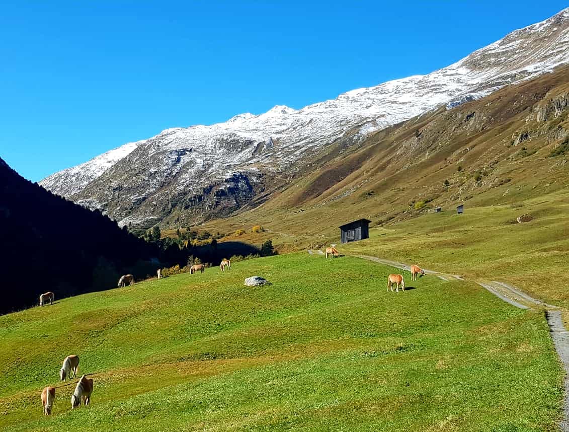 Von den Rofenhöfen folgen wir den Schildern über leicht ansteigendes Wiesengelände nach Westen, wo sehr friedlich die Pferde grasten. Kurz vor der Materialseilbahn von der Vernagthütte weist ein Schild nach rechts Richtung Vernagthütte, ab hier wird der Weg steiler und führt in Serpentinen auf den Platteiberg zum Vernagtegg. Auf ca. 2.200 m lag bereits der erste Schnee.